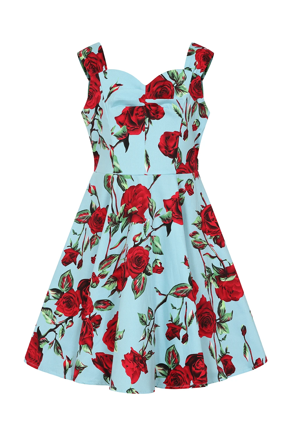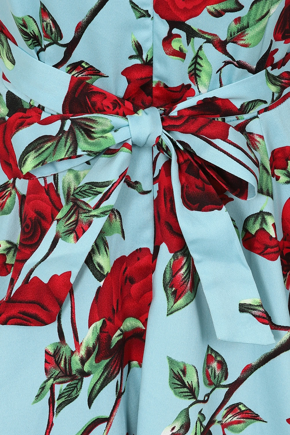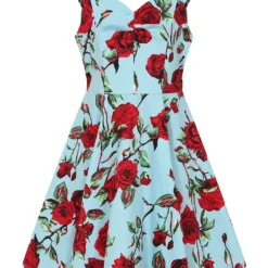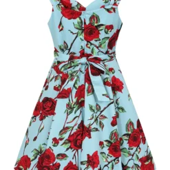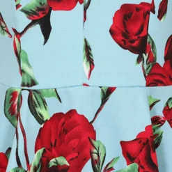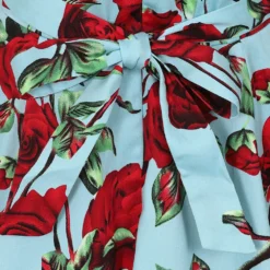 Beautiful floral spring/summer dress with a vibrant mix of red and mauve Roses with a touch green leaves against a blue background. This dress is a modern take on a classic style with a fresh print and sweetheart neckline with ruched over the bust detail and waist belt. It will be a key piece of your spring/summer wardrobe.