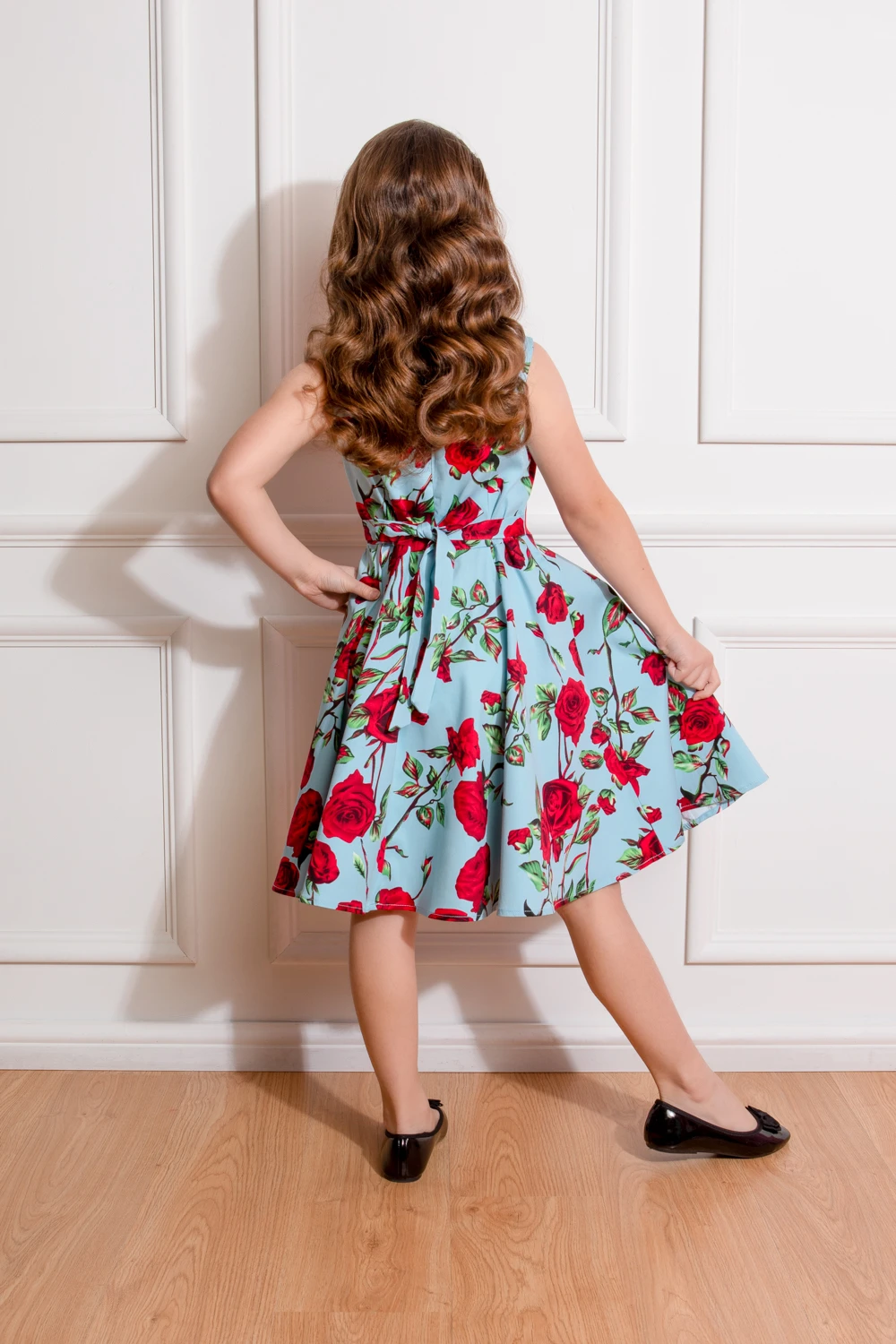Girls 50s Ditsy Rose Floral Summer Dress in blue: