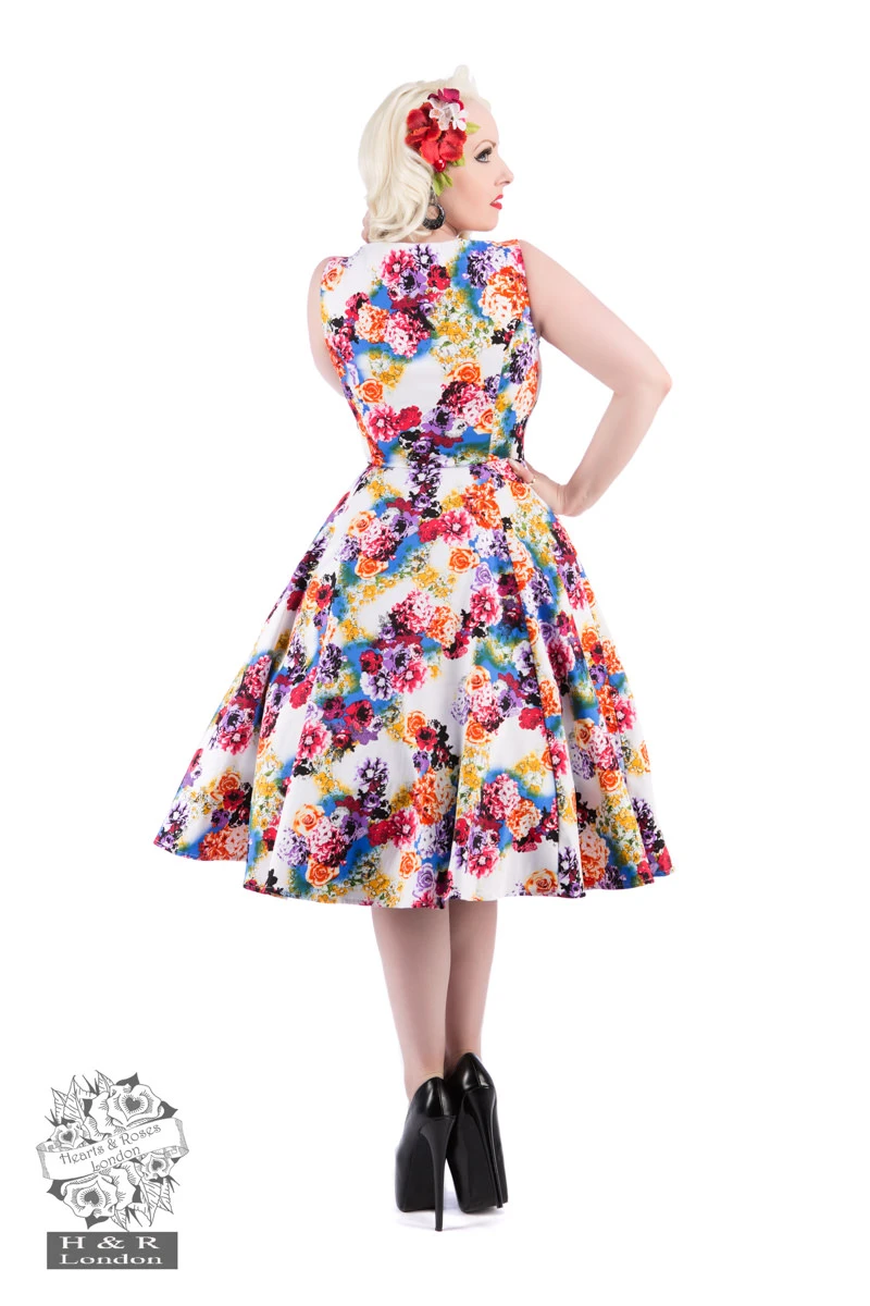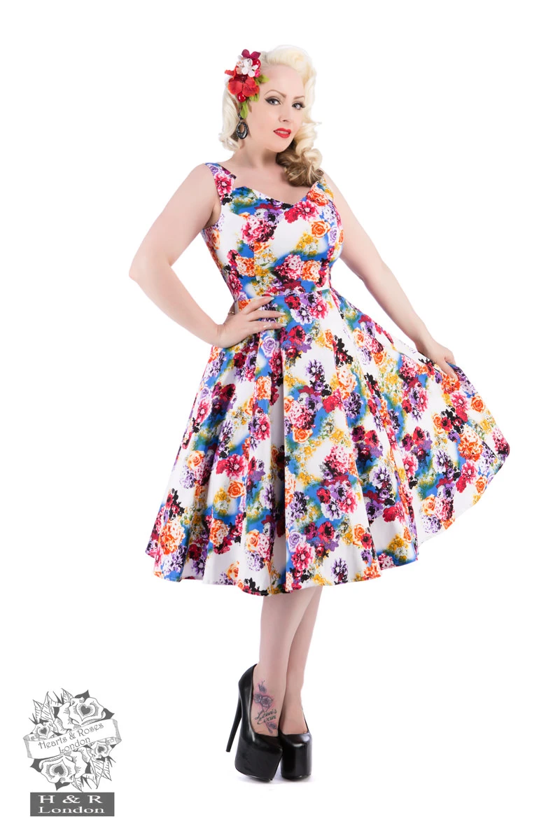 The clouds will part and the sun will shine right on you while you wear 50s Georgina Floral Swing Dress from H&R London! Bearing a striking pink, orange and red flower print set on sunny skies, this beautiful and unique dress fits beautifully on every figure. Dress is sleeveless, with a V-neck and 2 decorative side notches on the shoulder straps. Dress fully covers the back and hits just below the knee. Reinforced zipper for easy on, easy off. Add a Hearts & Roses white petticoat for even more whimsy!