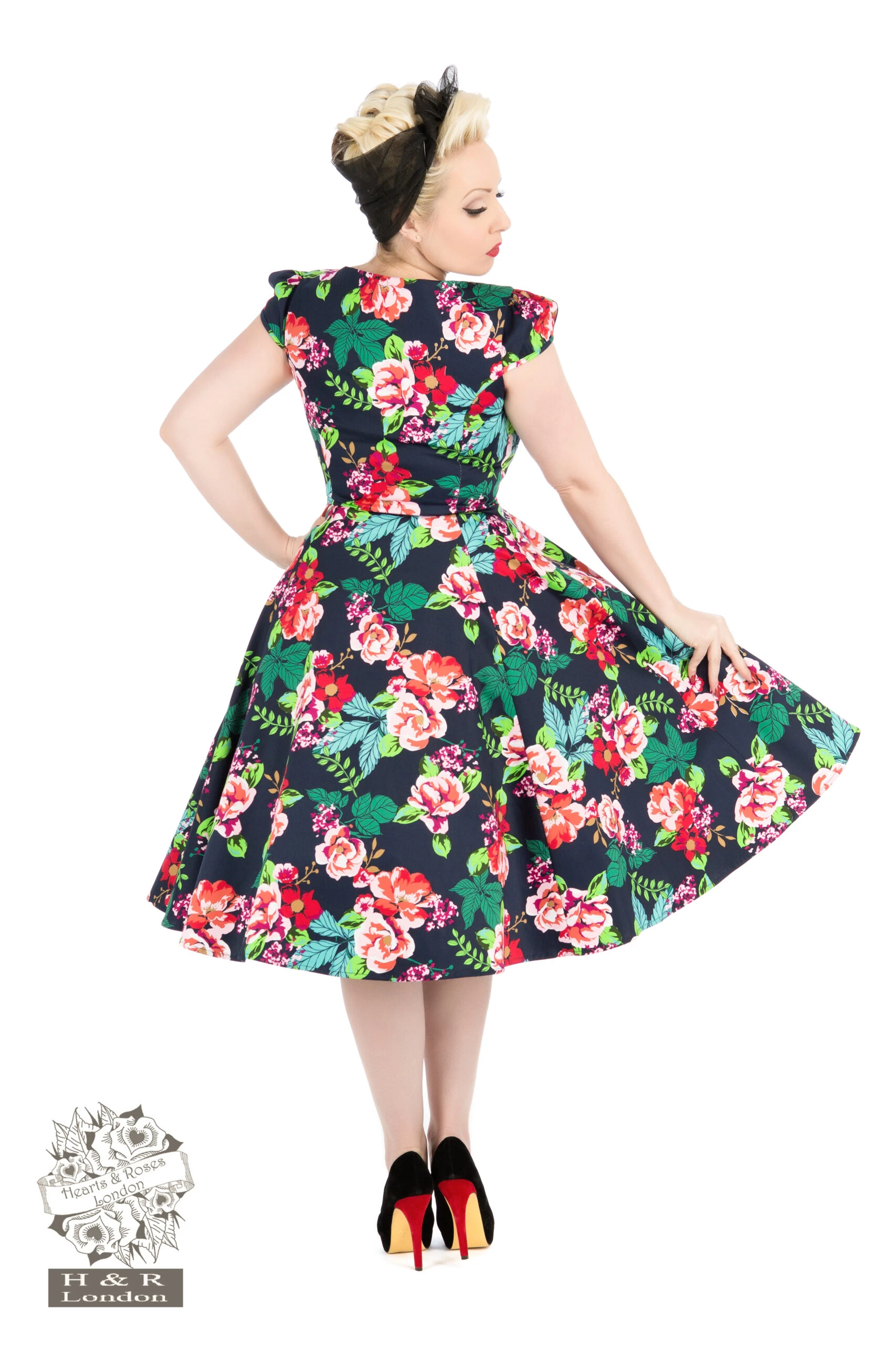 The 50s Lucille Tea Dress from Hearts & Roses London is so popular, we had to bring her back! Beautiful navy cotton cap-sleeved swing dress, created with bright red, purple, and melon coloured blossoms. Light green and pale blue leaves make beautiful bouquets on the Maria Swing Dress. Neckline is square cut with slight notch in middle, with a full swing skirt. Dress zips up the side for a comfortable fit.