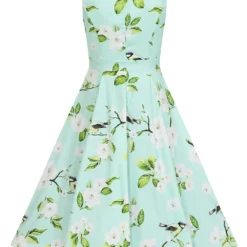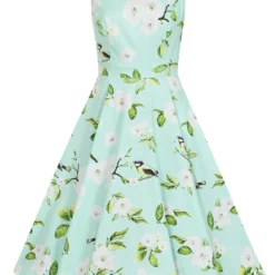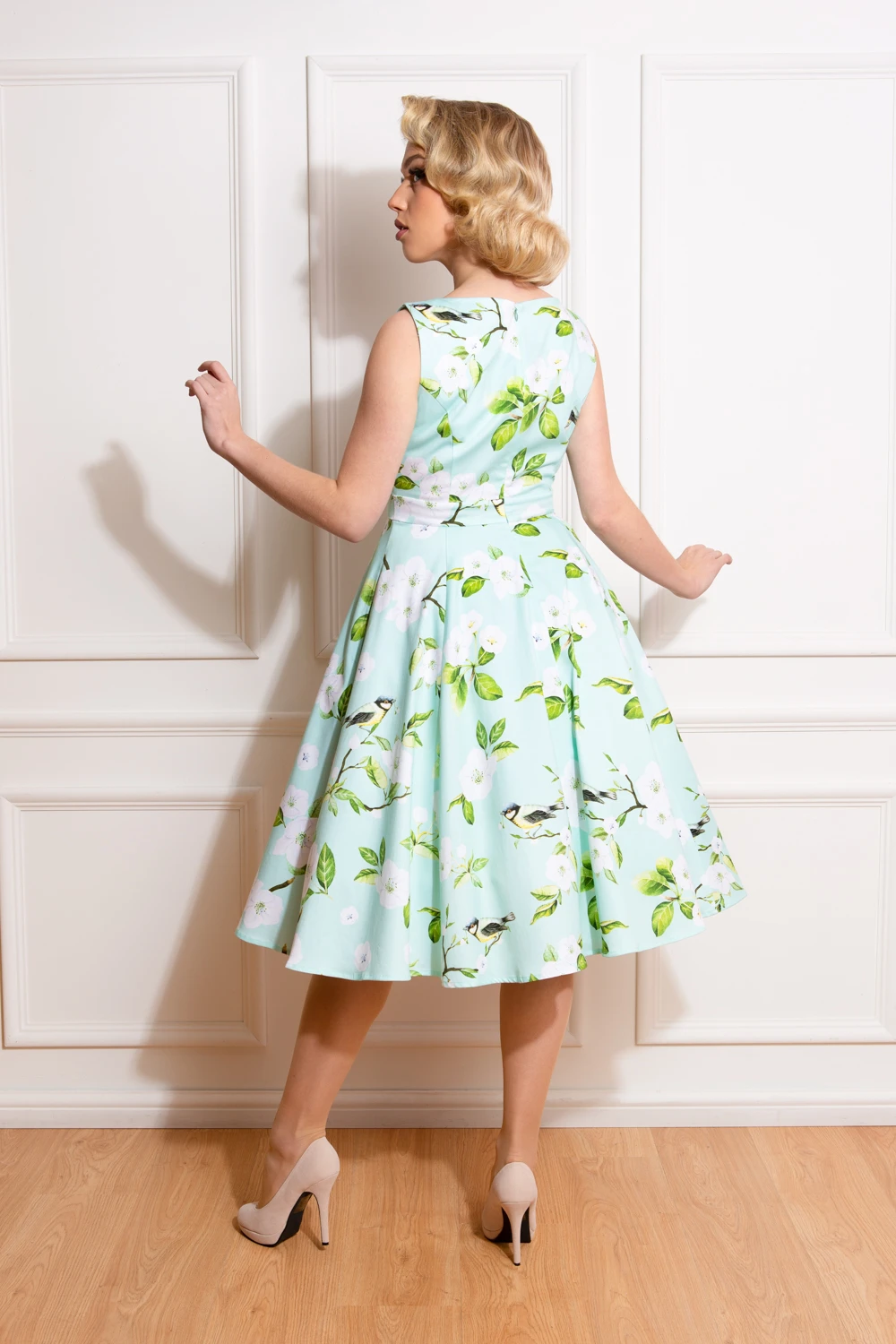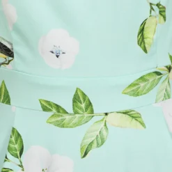 Encompassing the spirit of spring summer, this style is a delight with its soft green base colour, sitting below the white floral petals and green leaf pattern. The round neckline is easy to wear and works wonderfully with the fitted bodice shape. Including a waistband, this style gives that 50s charm as the swing skirt sways in the summer breeze. This dress is great for a daytime event like a picnic or a stroll in the park. It can just as easily be worn to an evening dinner by adding some jewellery to the outfit. People will sure to be green with envy seeing you in this stand out summer style!