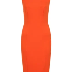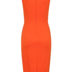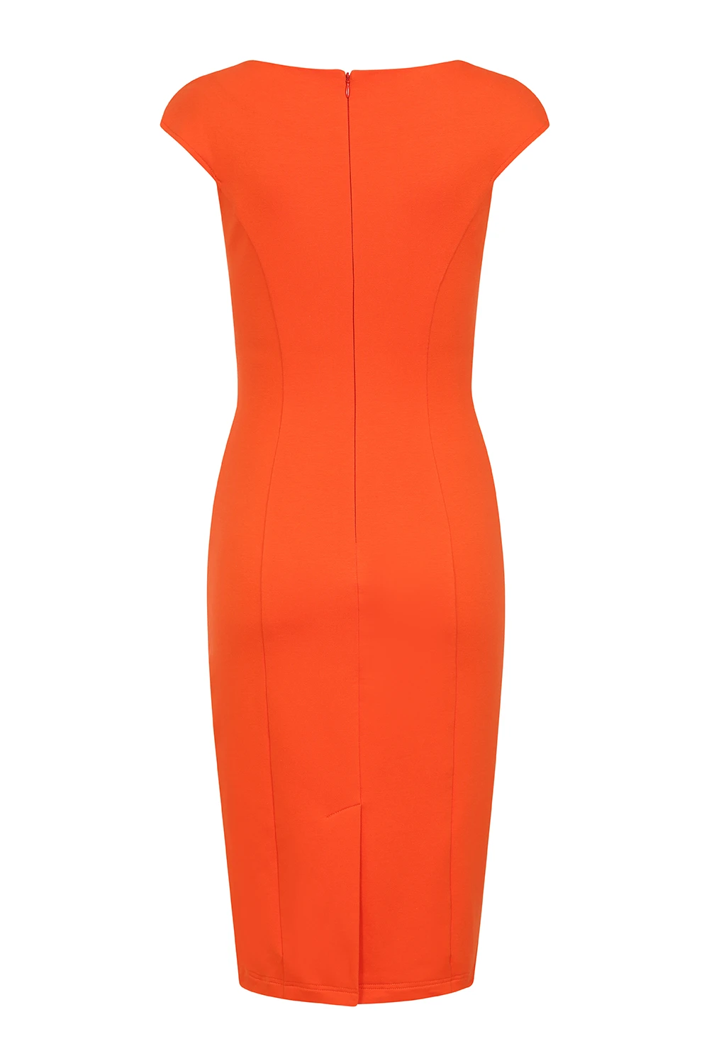 This striking orange beauty is the one to wear this spring summer. The stand out wiggle style is made to be seen, with its warm orange colour reminiscent of those good summer rays. Fitted to the body, the fabric is soft and stretchy, making it really comfortable to wear. The boat neckline and sleek cap sleeves balance well in their design, creating a simply elegant overall look. The back vent allows for further comfort in this style, along with the easy to use concealed back zip. This wiggle dress can stand alone or be worn with accessories, for either a day or night event.