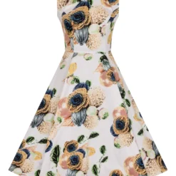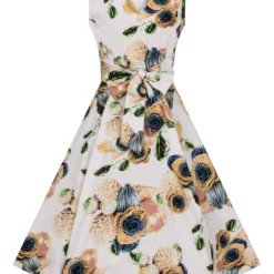 This vintage inspired beauty features a round neckline, a V shape cut on the back and a full swing skirt. The fixed waist strap can be used to achieve an elegant fit, making a cute bow at the back of the waist.