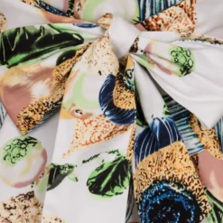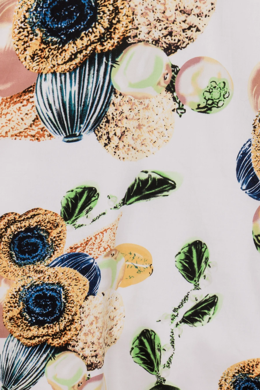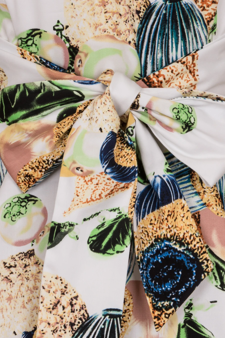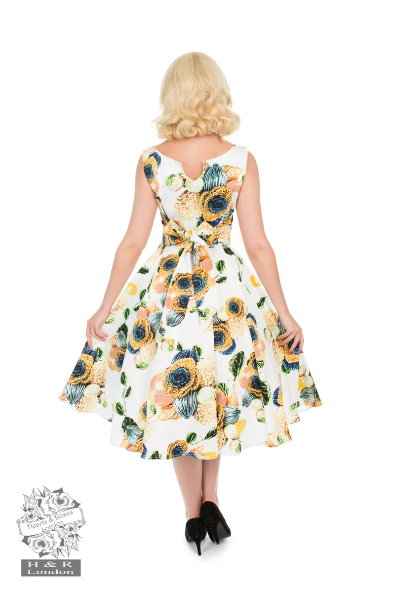 The colourful vegetation on the dress allude to the shape of a sunflower, and its colours vibrate the sunshine that deserves to be worn in. Make sure you have Arabella before she is gone.