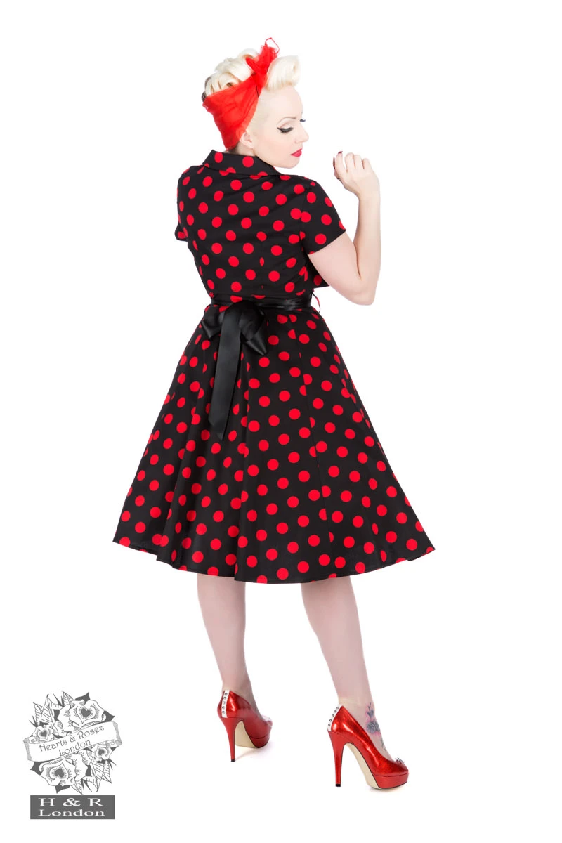 Step out in style in H&R London’s Polka Dot Swing Dress with Bolero! A styling pinup outfit, the Polka Dot Swing Dress with Bolero is a black cotton sundress with straps at the shoulders and an empire waist. Dress goes in at the waist and has a full swing skirt and matching short-sleeved bolero jacket. Bust line of dress has a bit of ruching for a flattering fit. Available in Black/Small White Dot, Black/Big White Dot, and Black/Big Red dot.