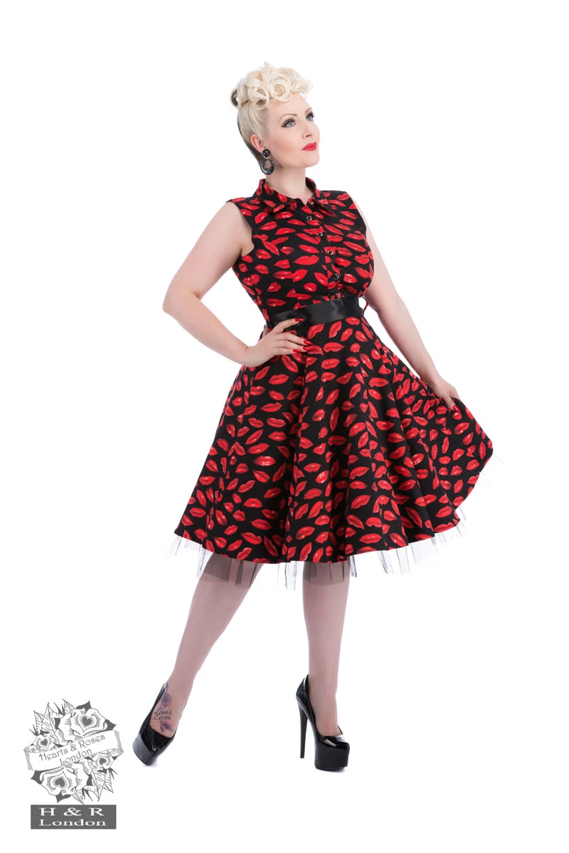 You will never be lonesome in H&R London’s new Sweet Kisses Dress! Shower yourself with kisses in this fabulously retro print swing dress. Luscious red lips surround this sweet A-line dress for a bit of fun and flirtation! Dress is sleeveless, with a Chelsea collar and beautifully functional black buttons. The back of the Sweet Kisses dress has a sexy lip-shaped cut-out in back. Dress has a built-in black petticoat, and comes with attached black satin sash.