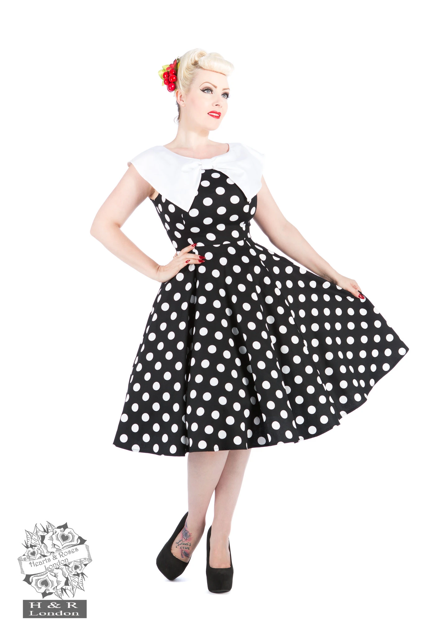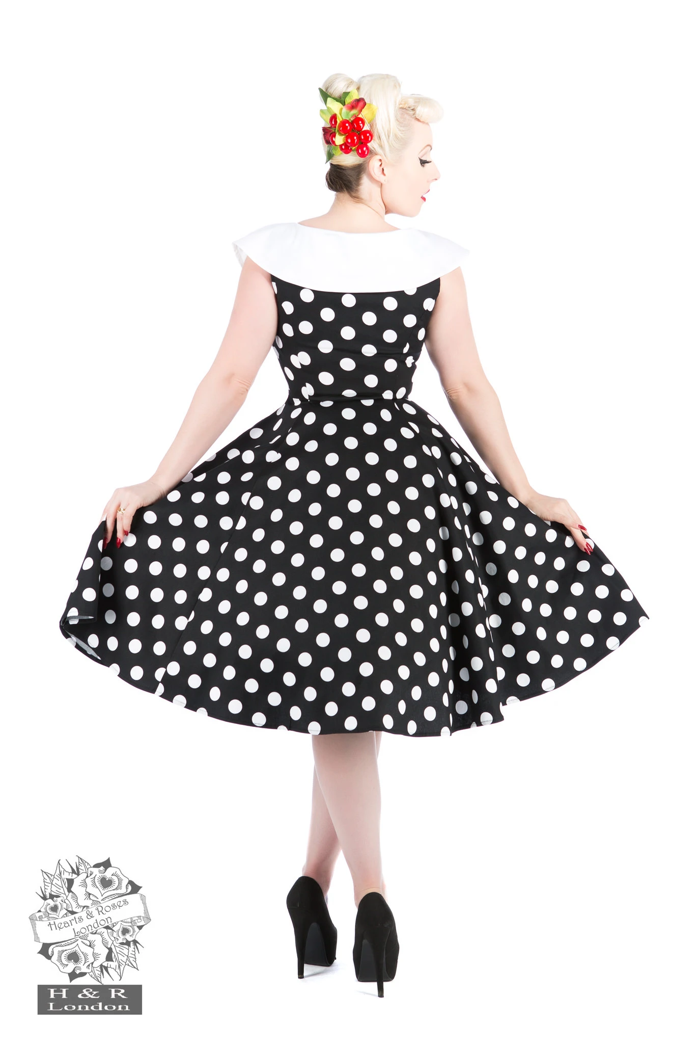 You will look cute in H&R’s Black White Polka Dot Swing Dress! It is a classic black and white polka dot swing drees with a pilgrim collar that help this dress stand up and out. A wide white modified pilgrim collar creates a beautiful bow top on the dress. Classic polka dots makes it a retro restock, as you will always need more! Collar extends down the back of the dress just to the dress just to the shoulders.