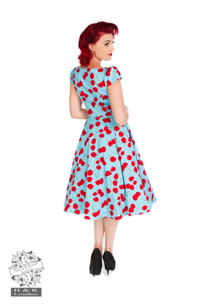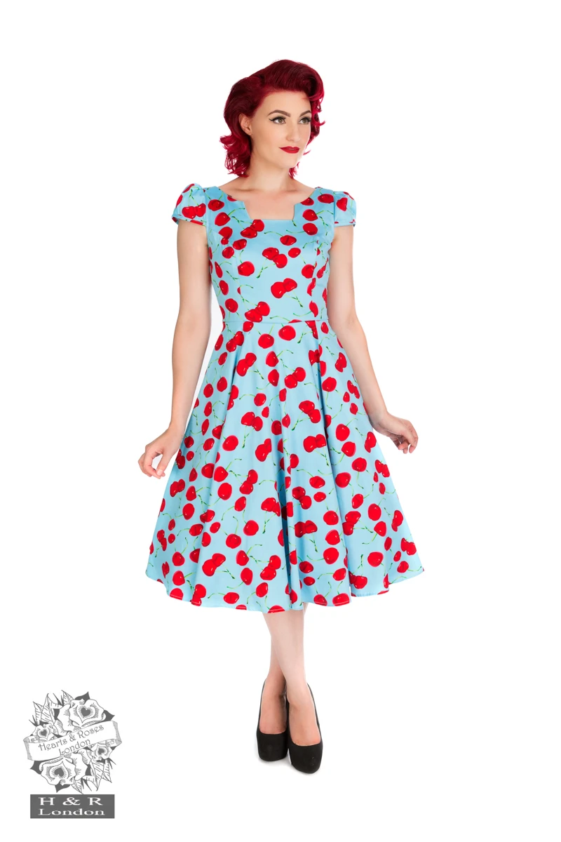 Beautiful Capped Sleeves Dress on a light blue cotton fabric. The dress features red cherries on a steel blue backdrop with a square sweetheart neck line for that prefect vintage look.