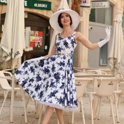 Hearts & Roses London’s brand new Blue Rosaceae Swing Dress will make you look and feel as beautiful as a porcelain doll. Set on a background of a pure porcelain white, the bouquets of cornflower blue roses and carnations are just precious. As elegant and luxurious as fine bone china, the Blue Rosaceae Swing Dress is a strappy swing dress, with cut-outs on the straps, a sweetheart neckline and a fully covered back. A full swing skirt creates the look of vintage, a look that never goes out of style!