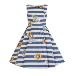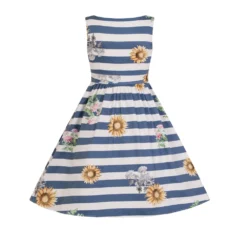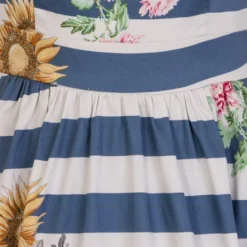 The combination of white and blue stripes set the scene for the kind of summer you will always remember. The dress features skyscraper sunflowers and pink cornflowers with a high boat neckline, delicate pleats circling the waist for the perfect frill skirt. A soft, stretchy cotton fabric makes this beauty perfect for the hot summer days or the evening parties.