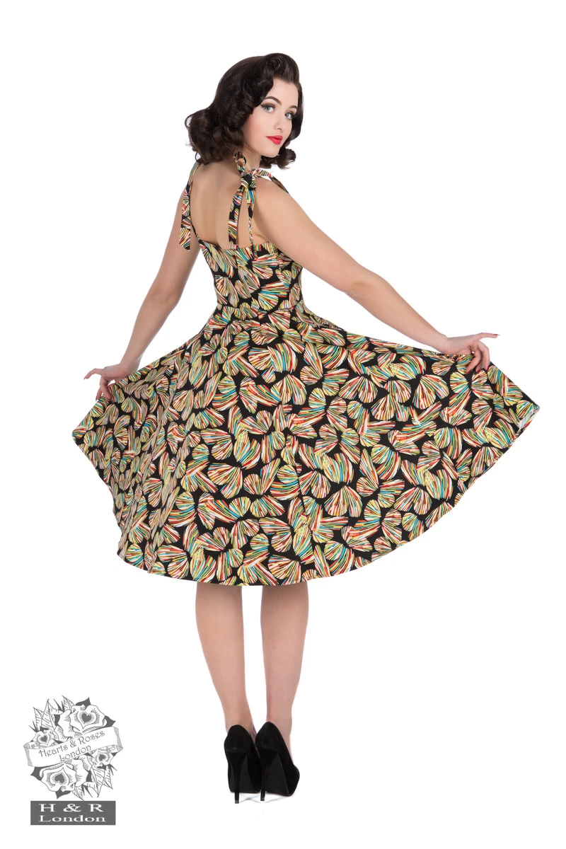 Be as carefree as a butterfly in H&R London’s Butterfly Prism Dress. This adorable sundress features a fantastic rainbow butterfly print, as if light was shining right through them! A black sundress with floating butterflies, the Butterfly Prism dress ties at the shoulders with adjustable straps, has a row of shiny black buttons down the front, and has a full swing skirt. Dress zips up the side, and hits just at the knee. Made out of a soft stretchy cotton, this dress will have you out of your cocoon and out showing off your beautiful colours in no time!