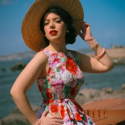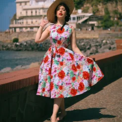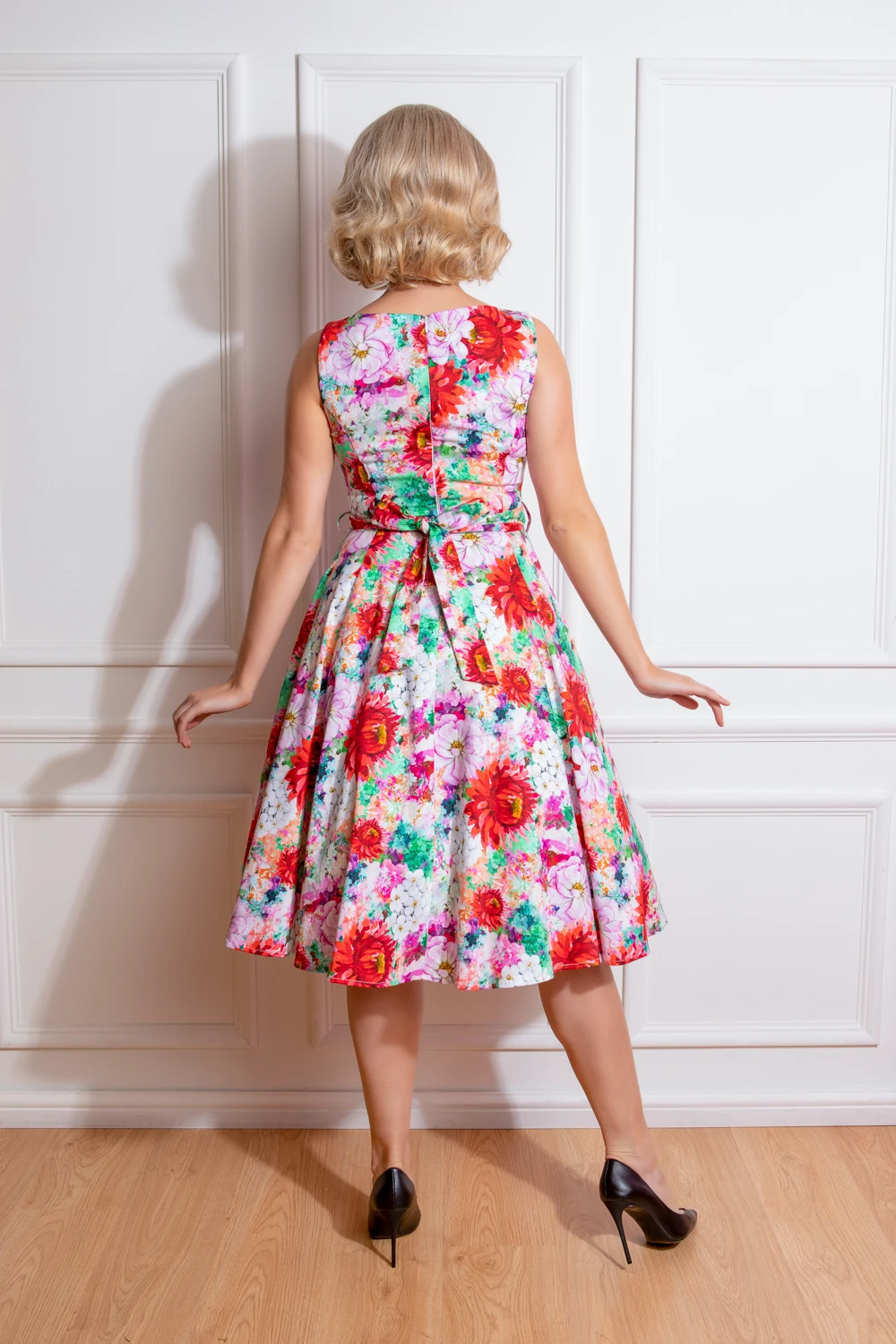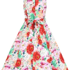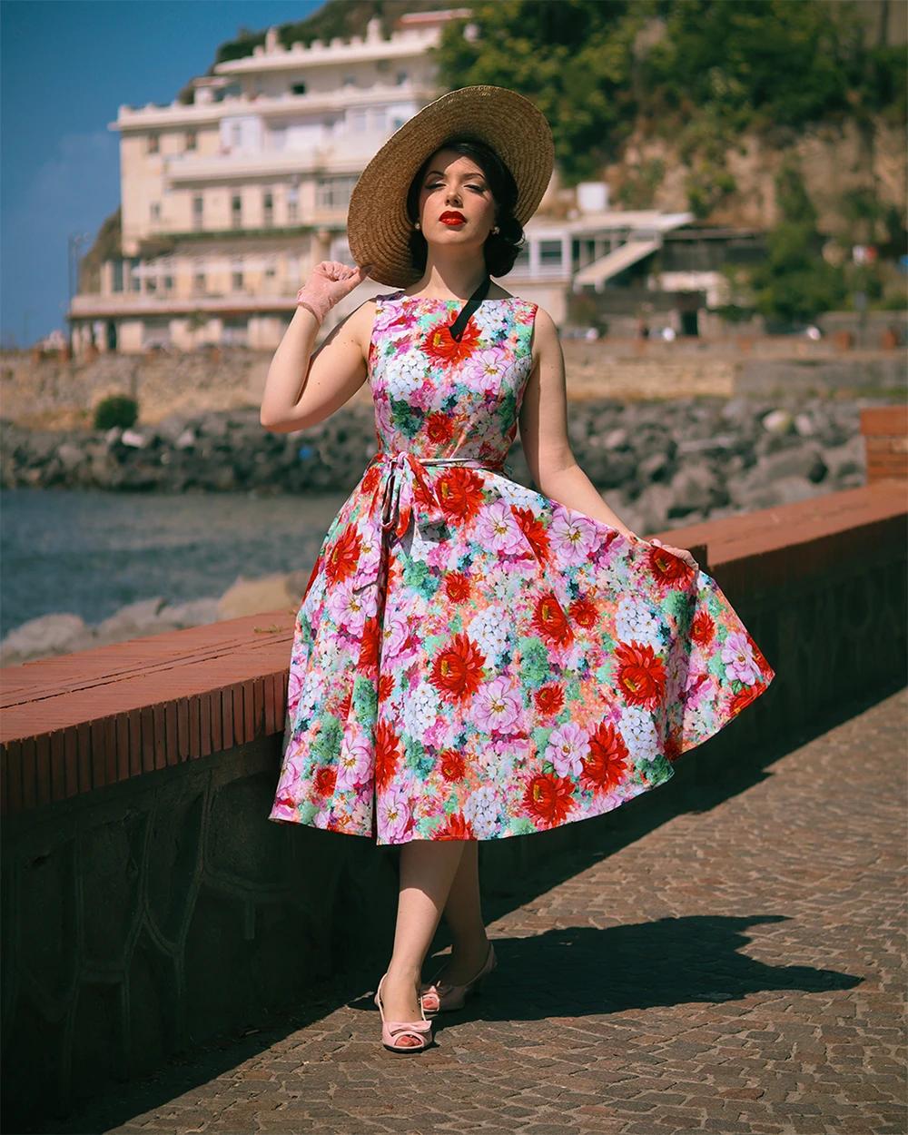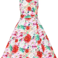Introducing our brand new retro summer style, our Casey Floral Swing Dress. Bursting with a rainbow of colours and decorated with florals of all kinds, this style is for those who want to stand out from the crowd. The full swing skirt is perfect for dancing all summer long. While the tie belt adds that’s sweet feminine touch. We haven’t forgotten those super handy hidden side pockets, designed to add extra ease to your day. To complete this look just add flats or heels and you’re all set!