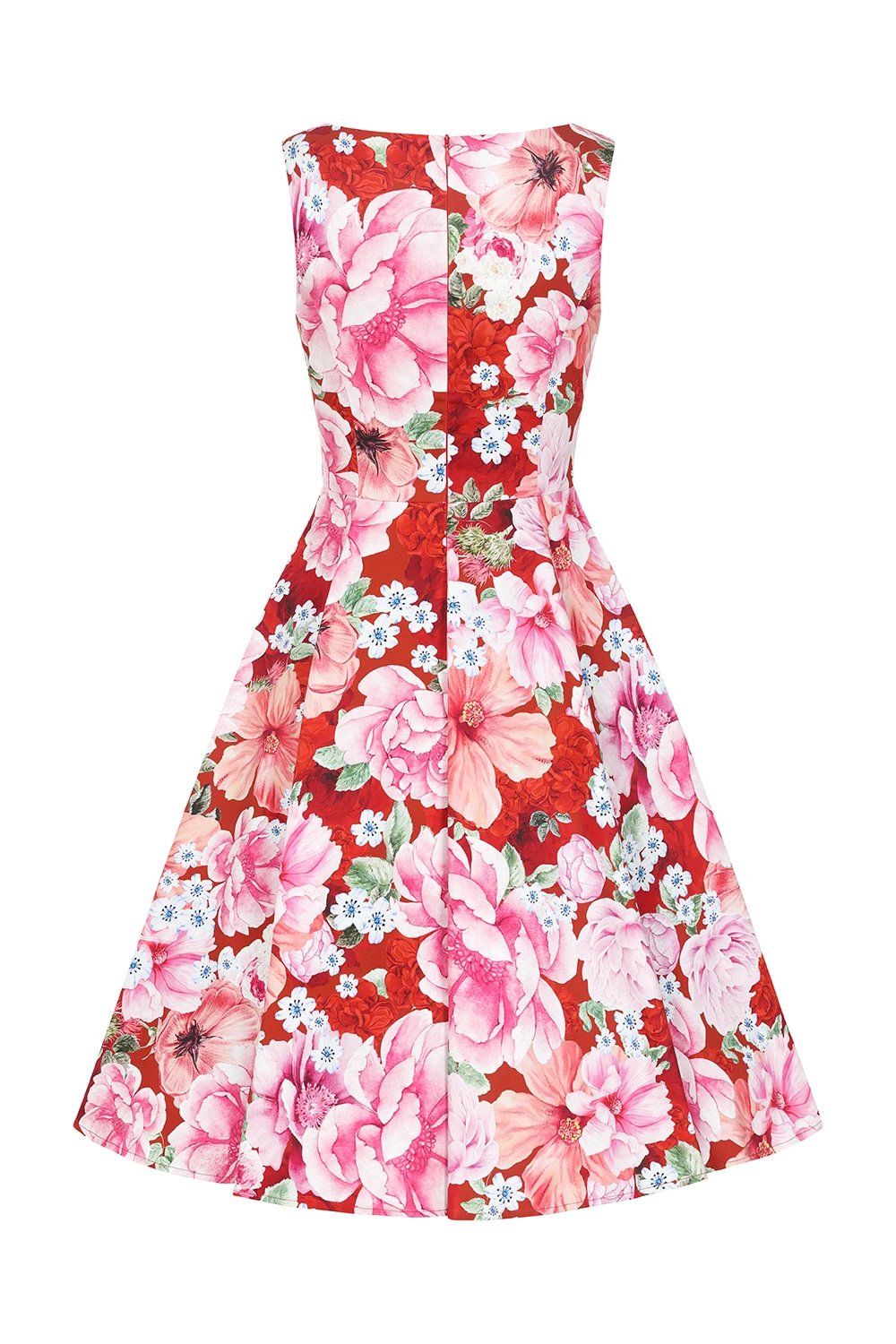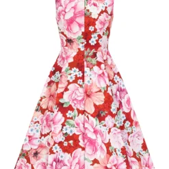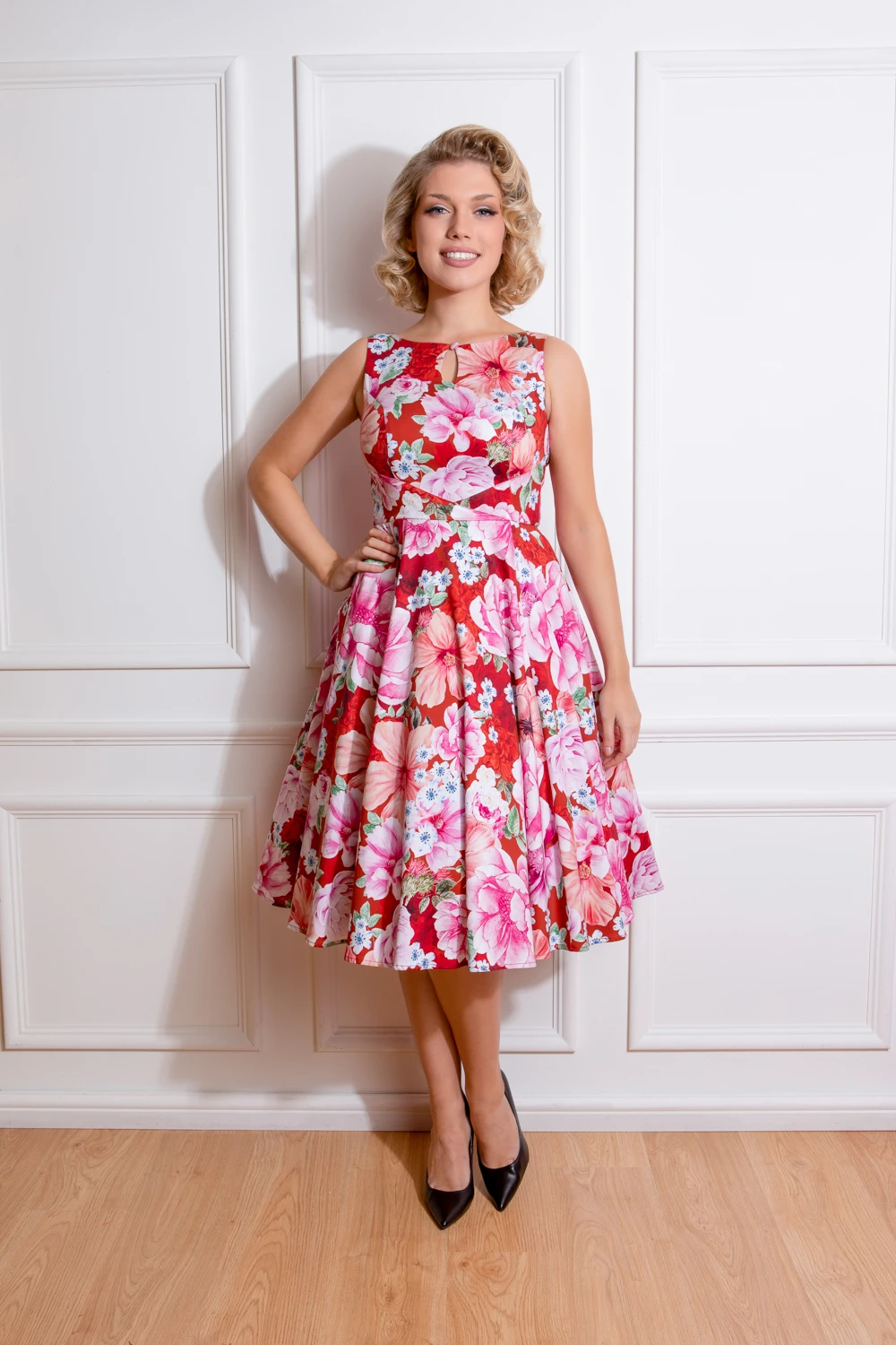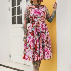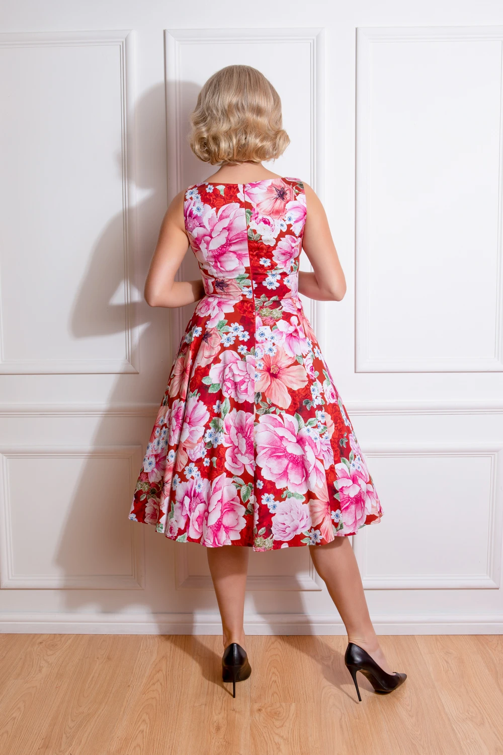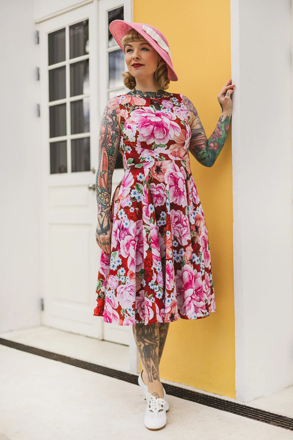 Welcoming our brand new Charlie Floral Swing Dress, bold and bright this new swing is made to be seen. The large scale florals in beautiful shades of pinks and whites alongside mini white and blue flowers, sit so nicely on the deep red base. The simple neckline with keyhole design detail sits neatly on top of the fitted bodice, giving this dress a beautiful feminine feel. To add to this is the full swing skirt which moves in such an elegant way as you walk, giving a true 50s feel to this dress. The bold print makes this style easy to wear to a dinner party or on a day strolling through the city. Whatever the occasion, this dress will have you looking the part.