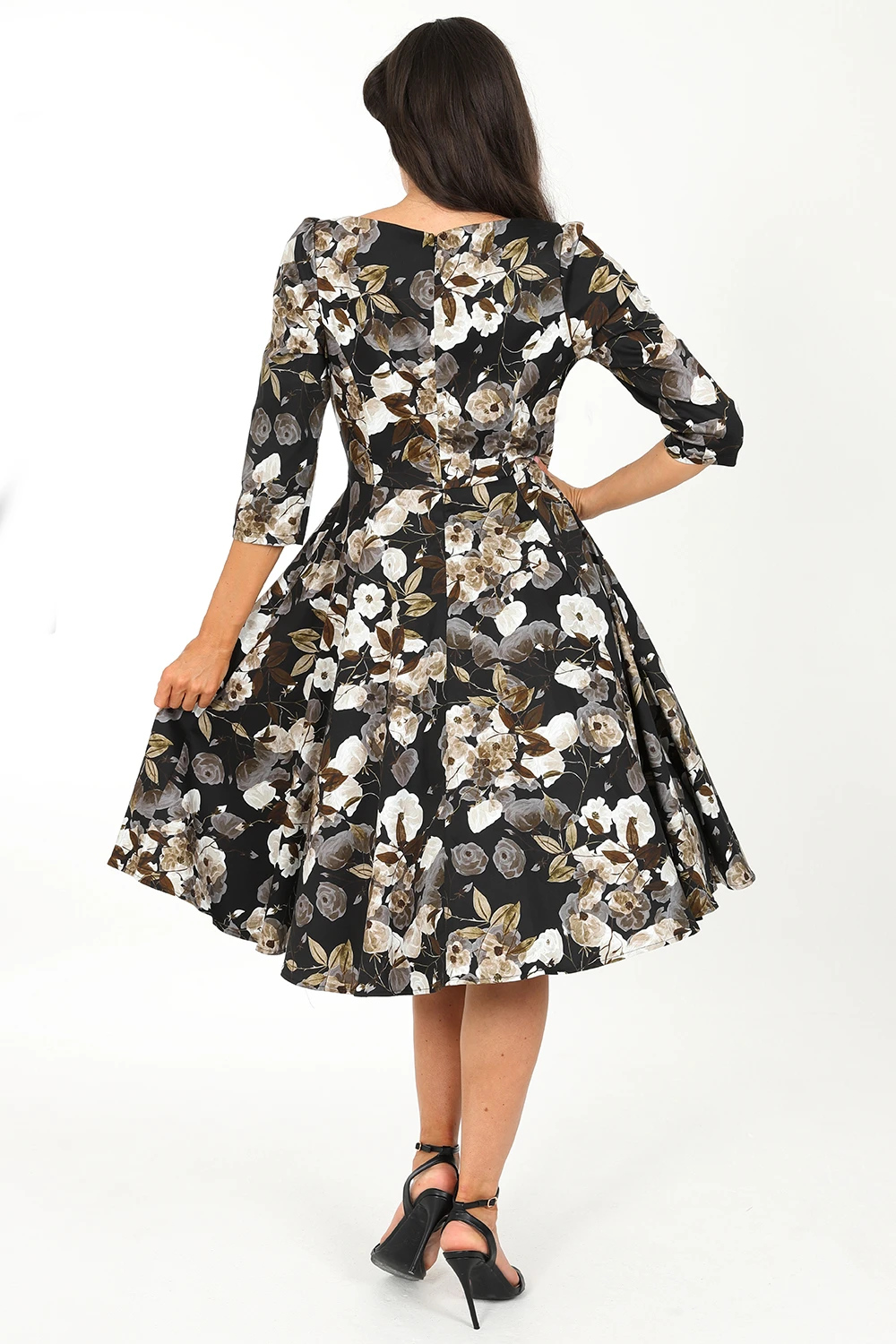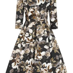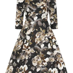 Introducing our beautiful new style, the Cora Floral Swing Dress. Designed with a bouquet of delicately muted flowers which sit on a dark black print base. The florals are made up of beige and cream tones to create a soft effect, making this an easy to wear piece. The boat neckline is cut to perfection and the fitted bodice features a shaped waistband. The flowing swing skirt is great for dancing the night away, keeping our love of the 50s alive and well. We haven’t forgotten about the hidden side pockets! There to make your day that bit easier. This style can be worn as is or dressed up with a clutch bag or jewelry of your choice.