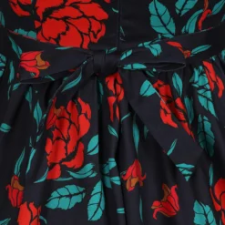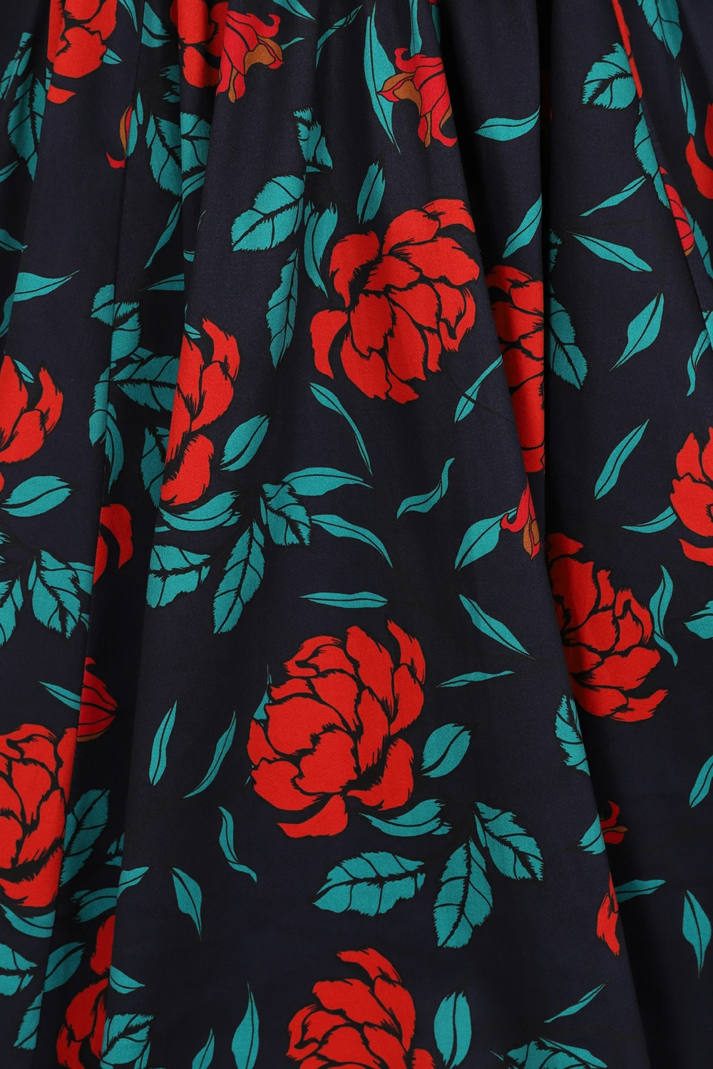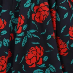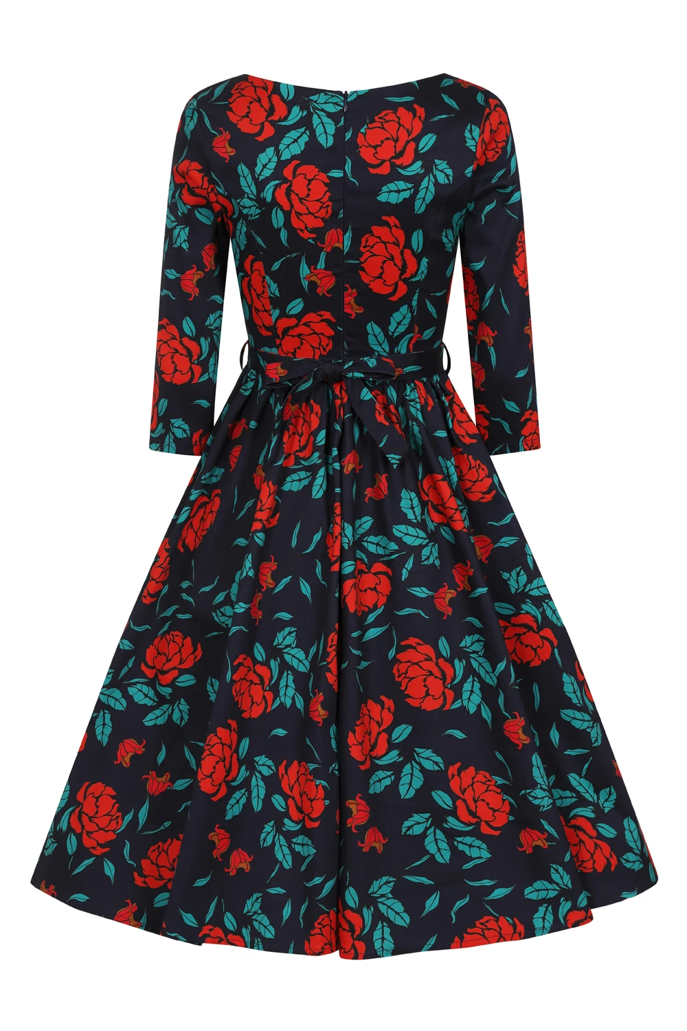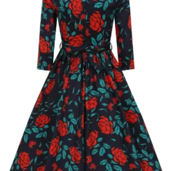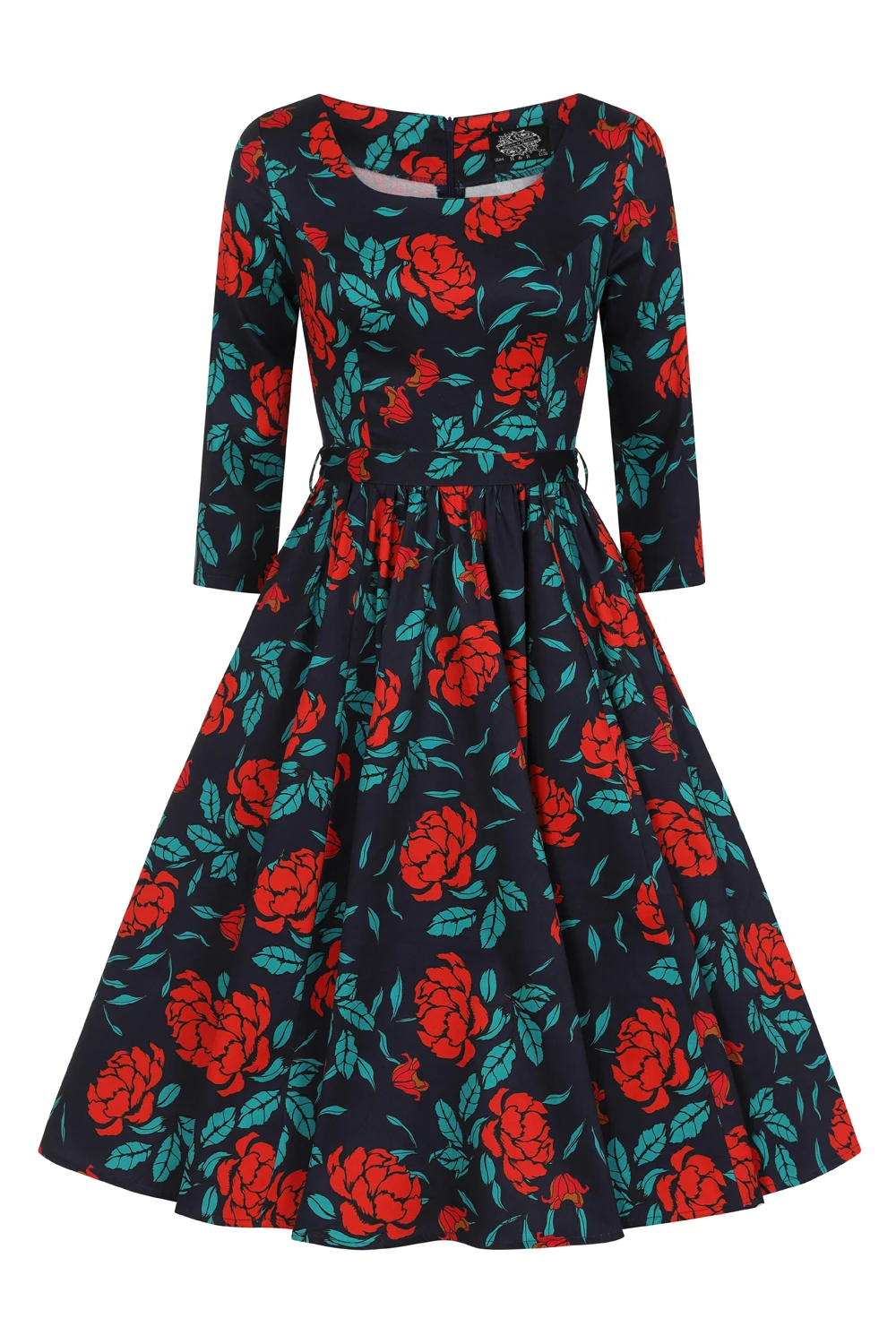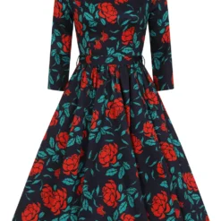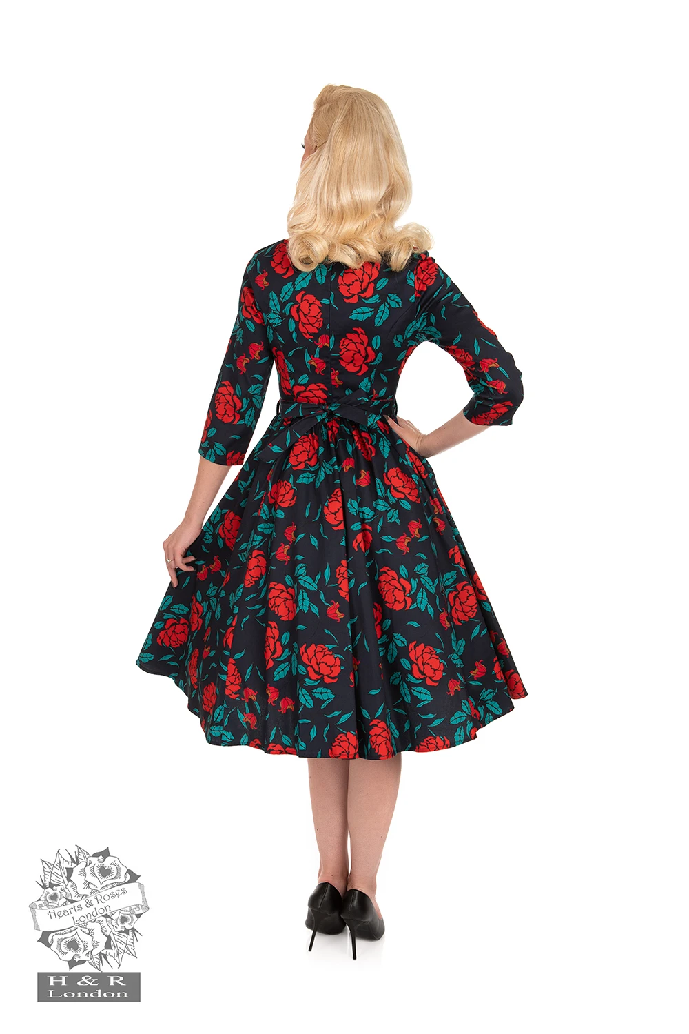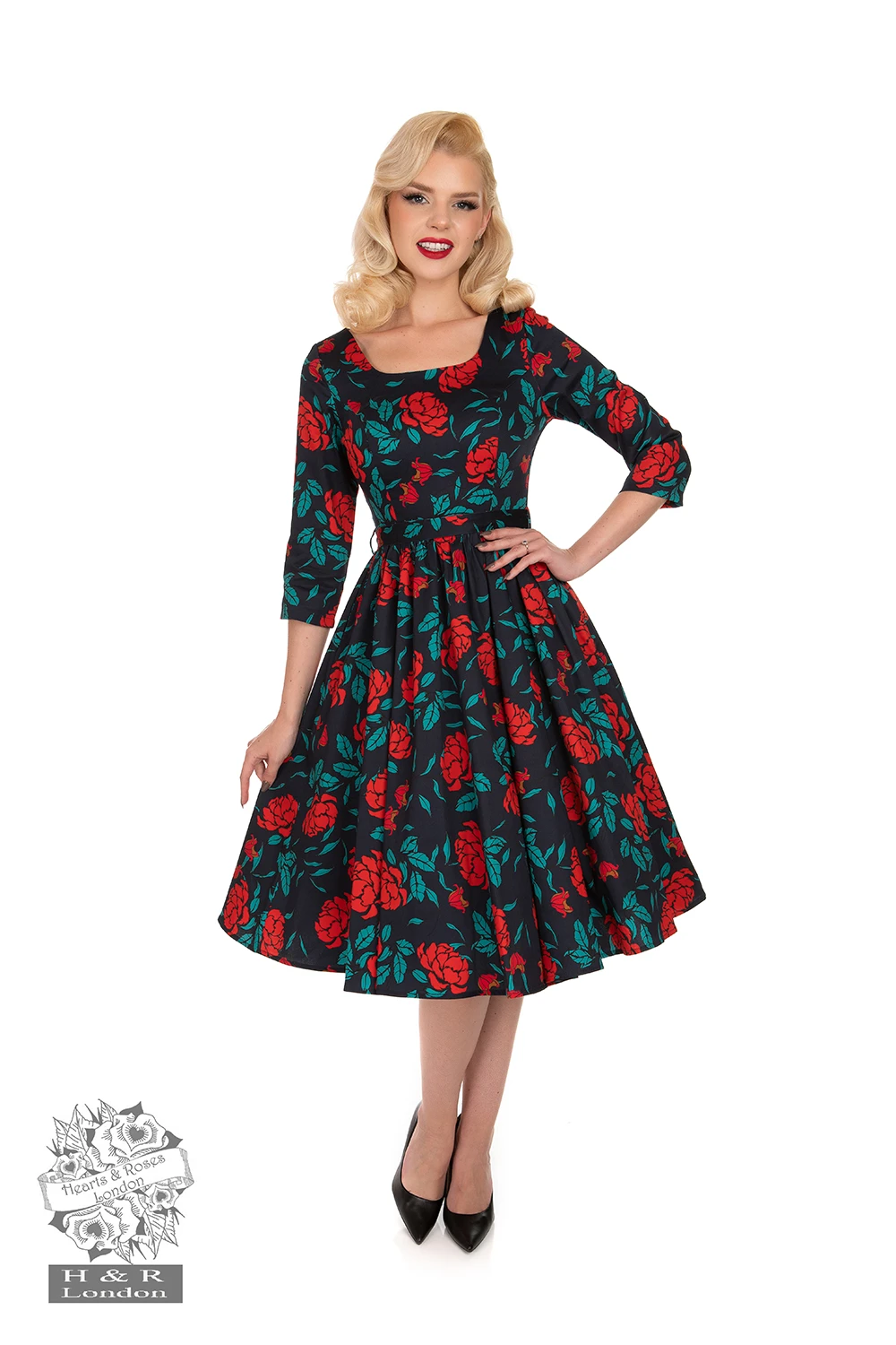 Dahlia a classy new floral swing dress brought to you by H&R London. Our beloved winter swing dress comes with a fine rose print on a navy-blue base giving you a chic retro look. The tie-belt and stretchy cotton fabric will give you the perfect vintage silhouette without compromising on comfort.