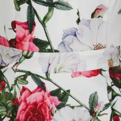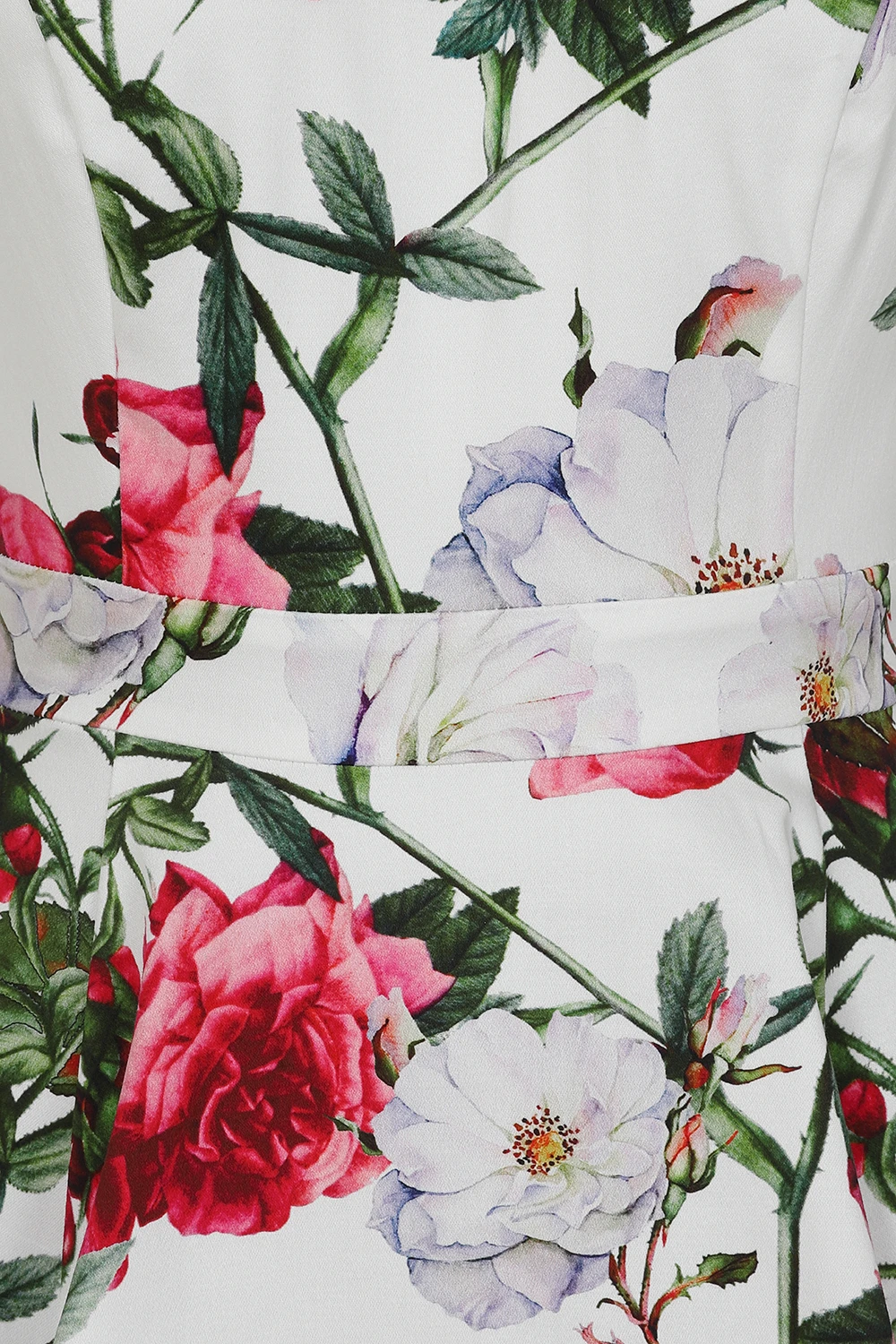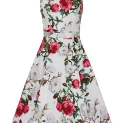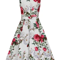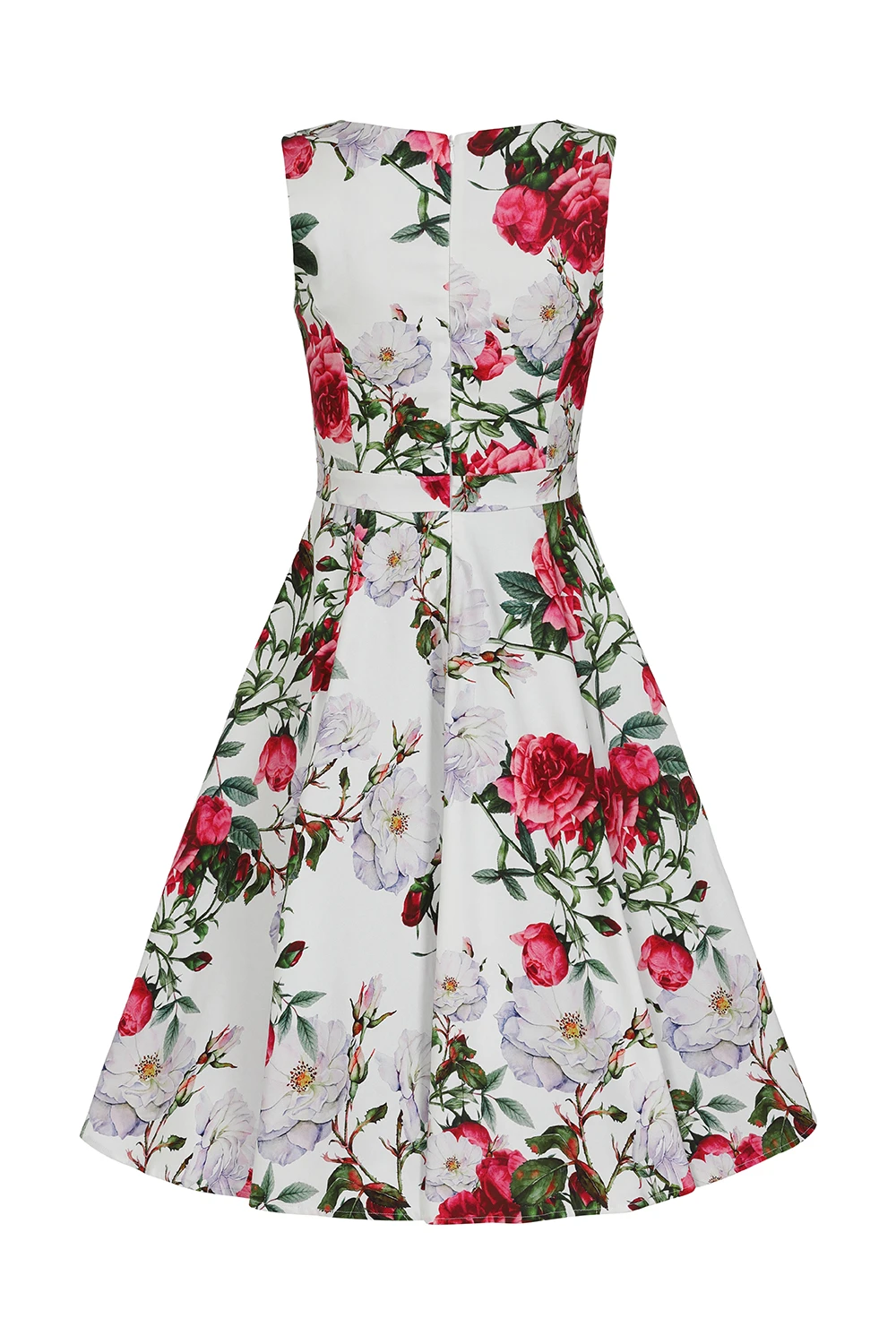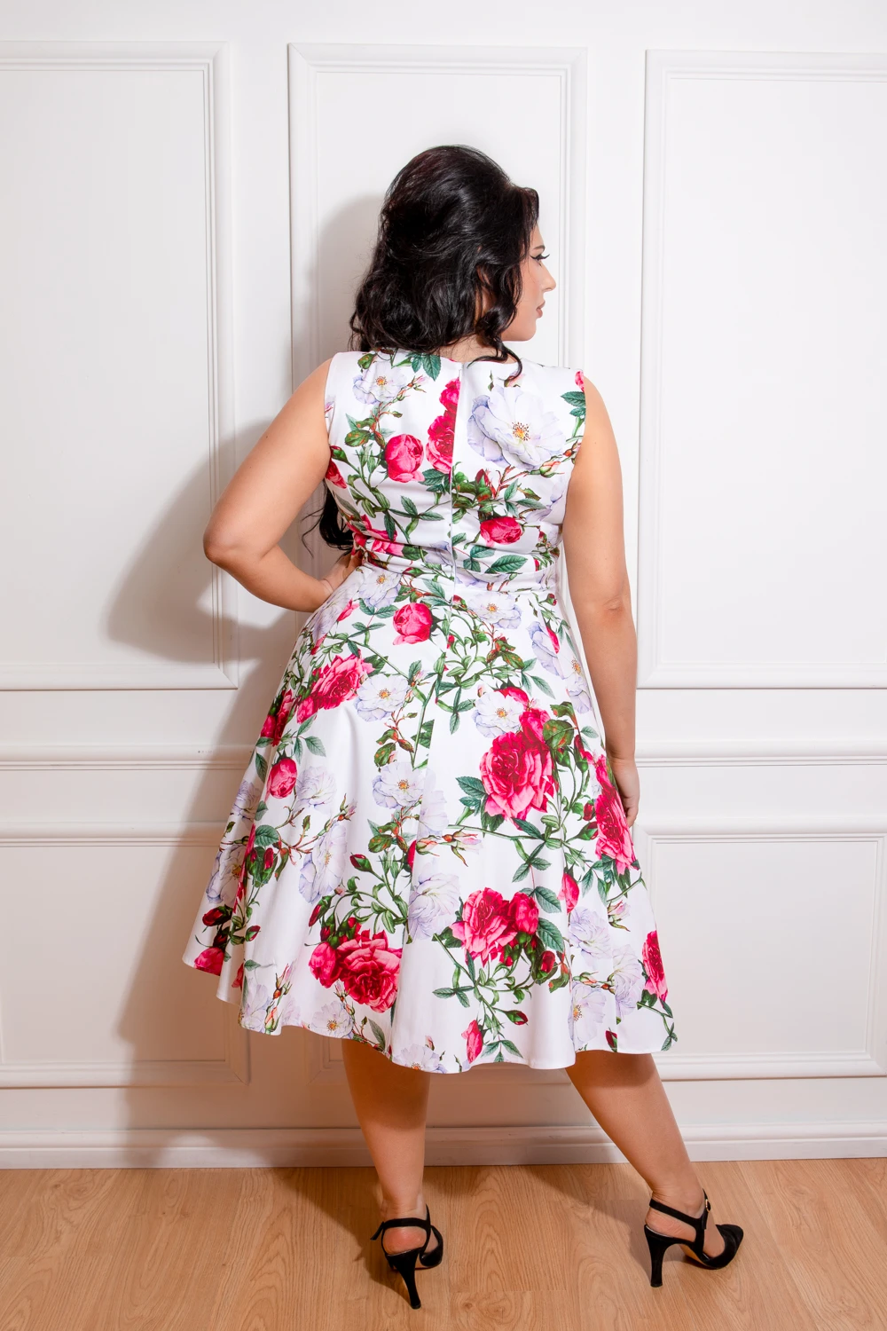Designed with high elegance in mind, our new Debbie Floral Swing Dress is perfect for an evening out in the city or a picnic in the park. This versatile piece exudes style with its strong floral motif lying on the crisp white base, perfect for catching the eye of the beholder. The classic V neckline is incredibly elegant and sits neatly on the neckline with front pleats. The waistband cinches in the waist, accentuating the full flowing skirt, making this a 1950’s dream silhouette. Pair this style with flats or heels to complete the look.