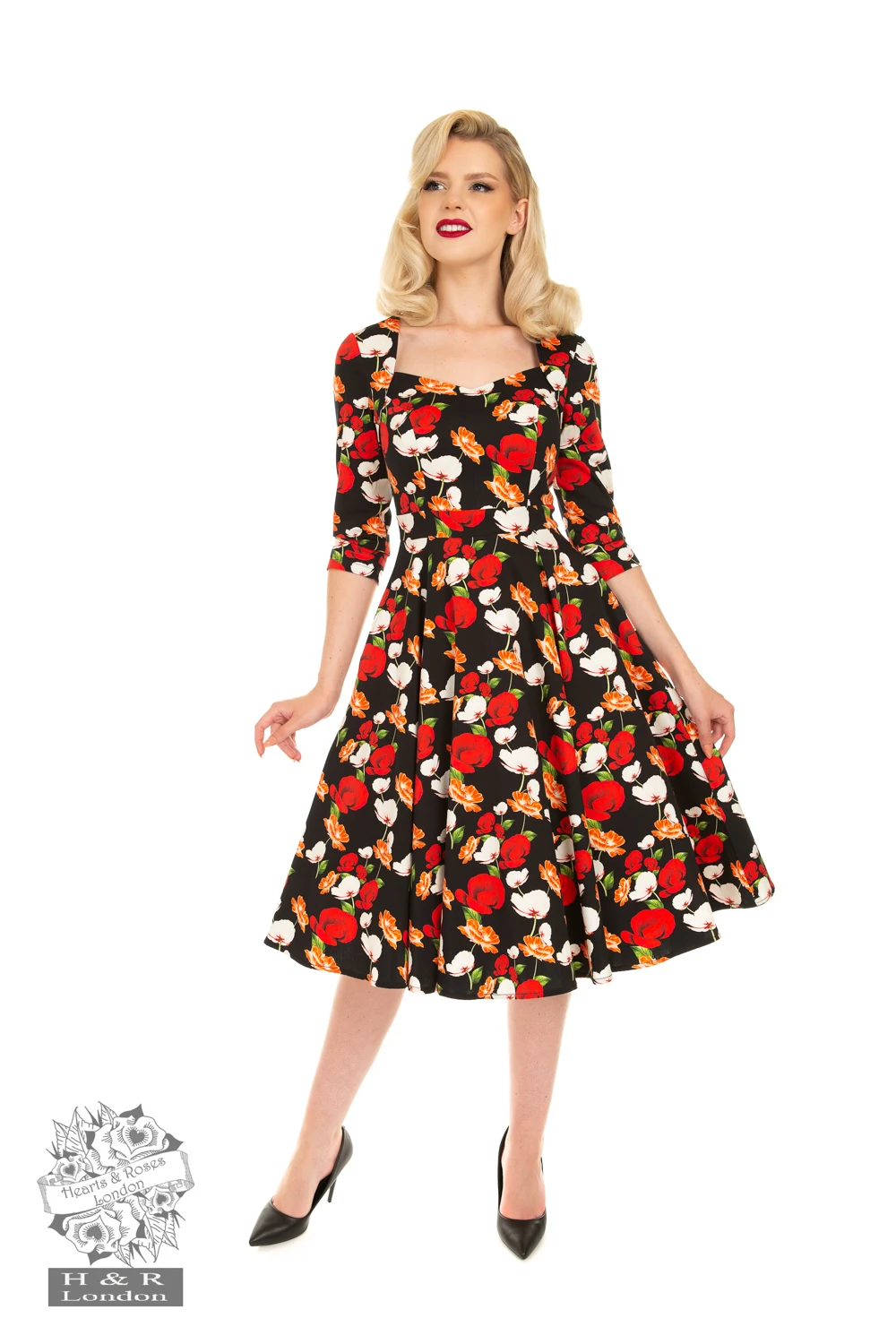 Our new Delia Floral Swing Dress is a sophisticated number. Its large scale dark red roses, orange and white poppies with green stems sit perfectly on the dark base, making this a stunning and strong winter print. The sweetheart neckline works wonderfully with the shoulder panel to add that added design element that catches the eye and the waistband fits neatly above the full swing skirt. We have added our classic concealed side seam pockets to keep your treasures safe. Add your favourite jewellery to take this style from day to night!