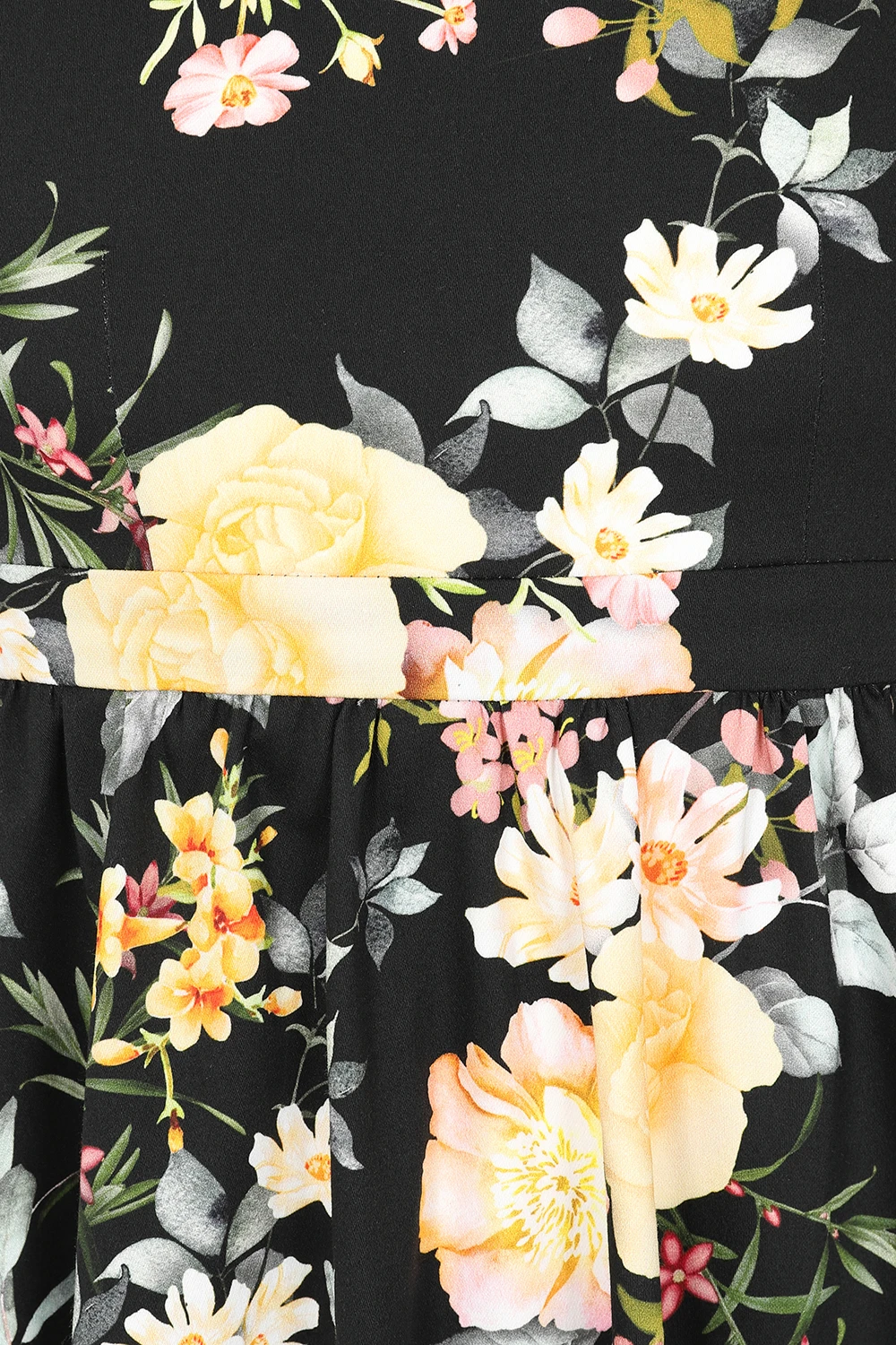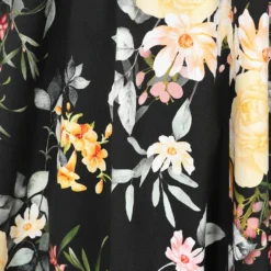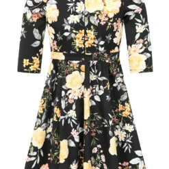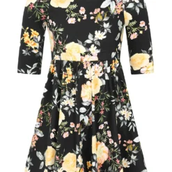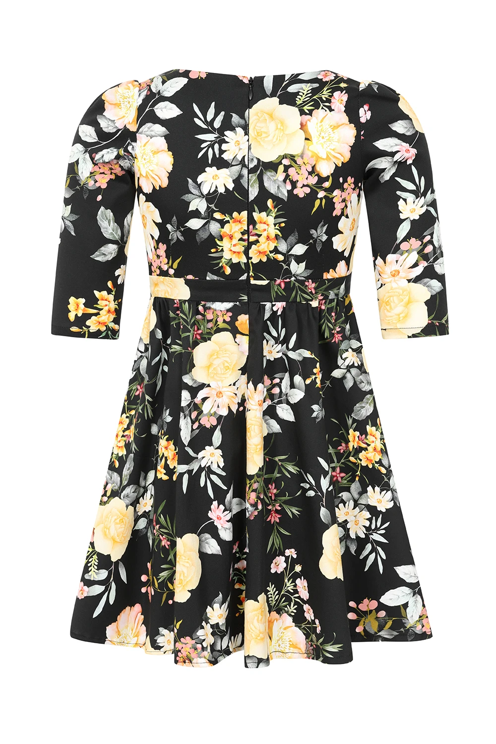 Welcoming our new Eleanor Floral Swing Dress into our new A/W collection. This floral style is perfect to bring some colour into the winter season with its buttery yellow florals, salmon petals and green leaves all against the black background. The beautiful scattered print works in harmony with the simple 50s shape of the dress. The round neckline, gathered ¾ length sleeves and gathered waist make this piece easy to wear for all. The dress is also really comfortable, being made with our classic stretchy cotton. Just pair with your favourite shoes and you’re ready for your next adventure!
