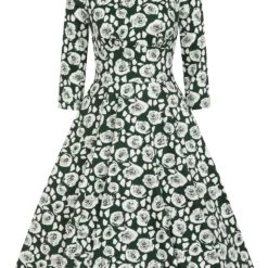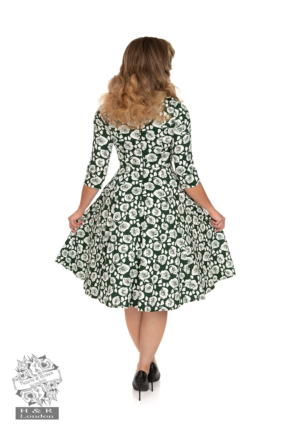 Emelda is an autumnal beauty, with her emerald green shade topped with cream florals, she is a true unique vintage-inspired piece. The classic boat neckline sits beautifully with the gathered empire line, giving this piece a standout feminine look. The hidden pockets are great for keeping your treasures safe while you wear this piece out and about. Pair this style with flats or heels of your choice for your day or evening look.