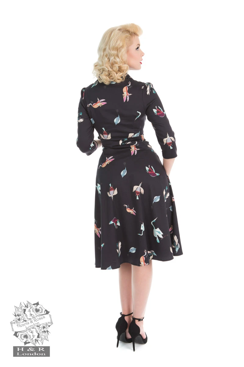 Feel free like a bird in our new printed vintage style, entailing a gorgeous print of charming birds on the bodice down to the swing of the skirt. The neckline features a cutout Peter Pan collar neckline, which is the perfect touch to the design. The design is fabricated on H&R signature soft black stretchy cotton fabric material. Grab your vintage designs before time ‘flies’ 😉