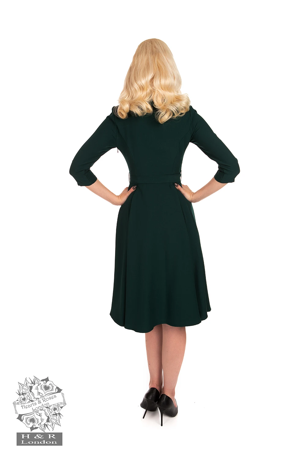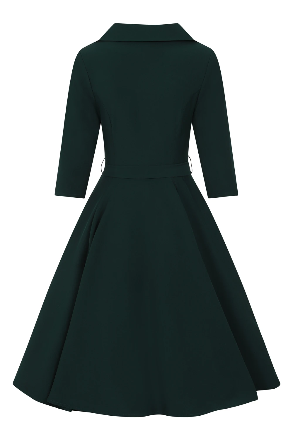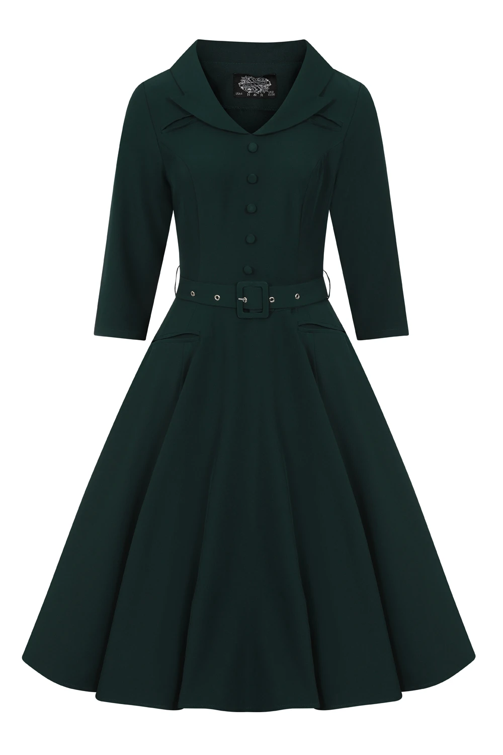 Our new striking Gabriella Swing Dress in emerald green is a must have this season! Its stunning collar gives beautiful drama to the neckline, while the decorative buttons float down the front to add that feminine touch. We added stand out welt pockets not only for practicality but also to add to that 50’s elegance. The matching belt cinches in at the waist adding to that 50’s silhouette. This piece can easily be worn day or night, just pair with flats or heels and you are all set!