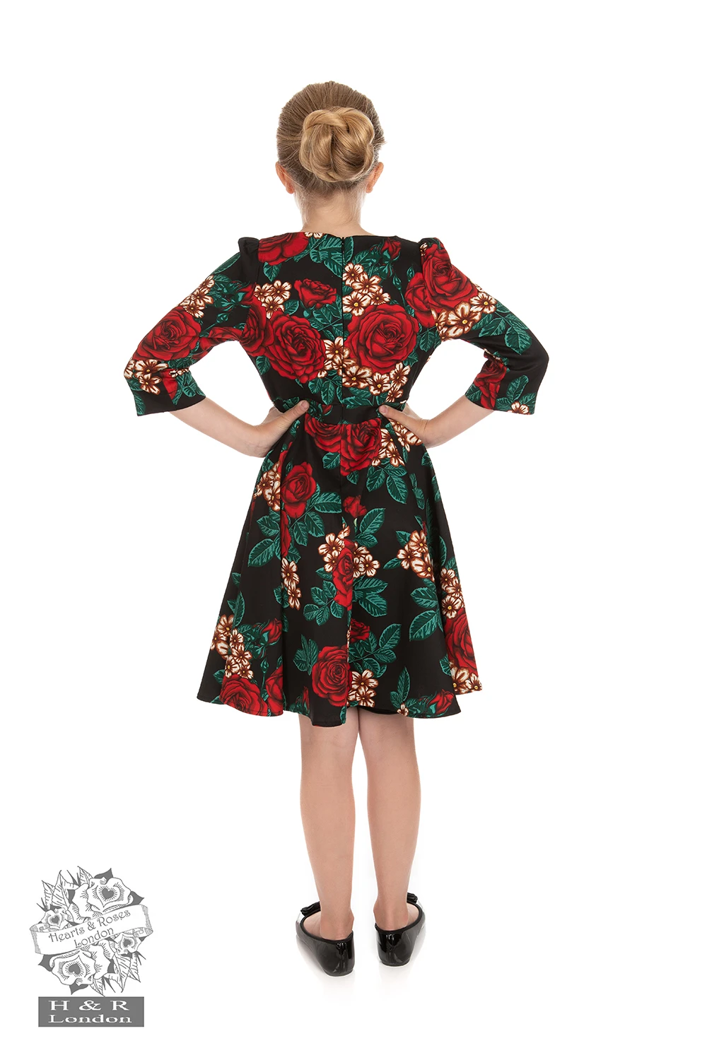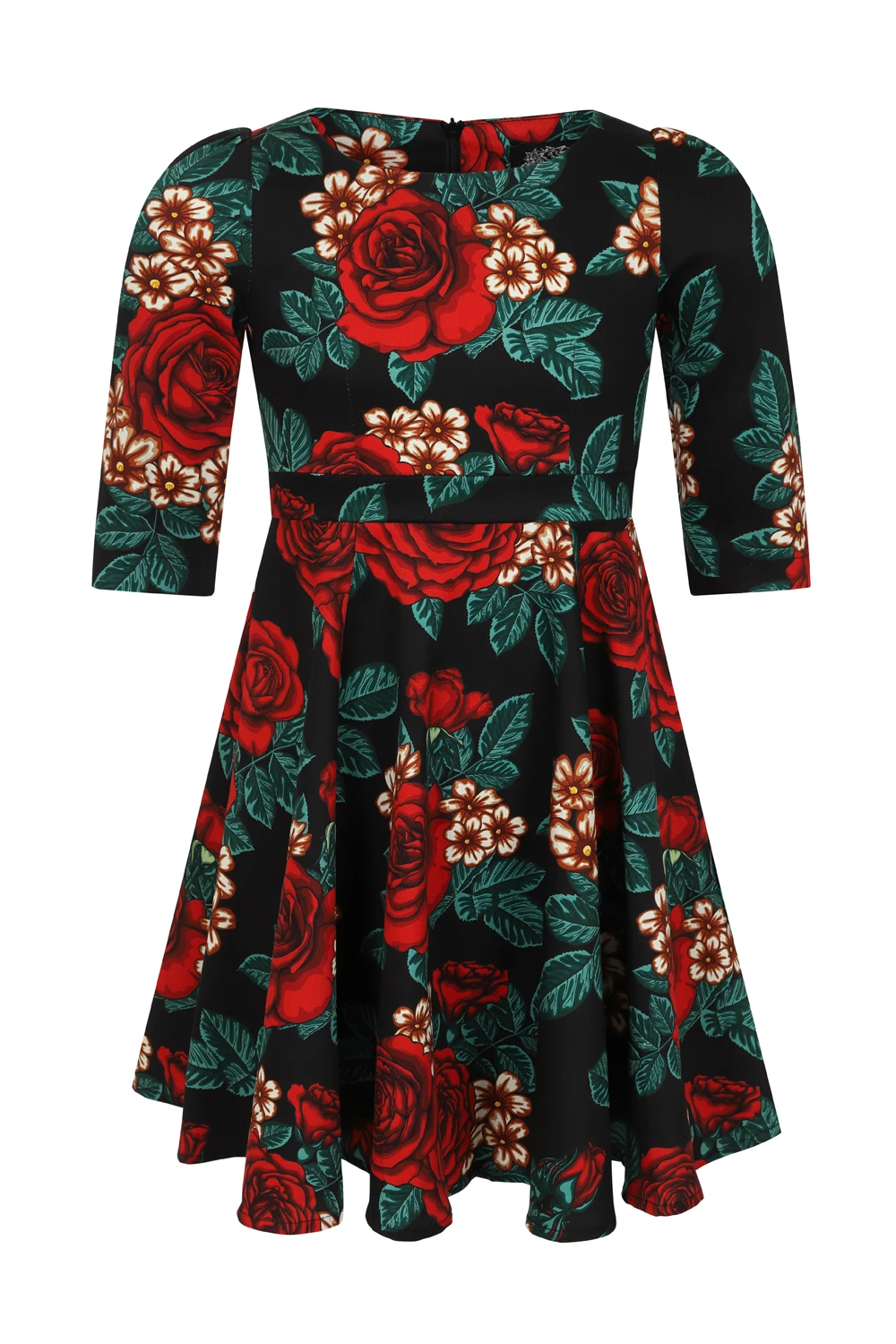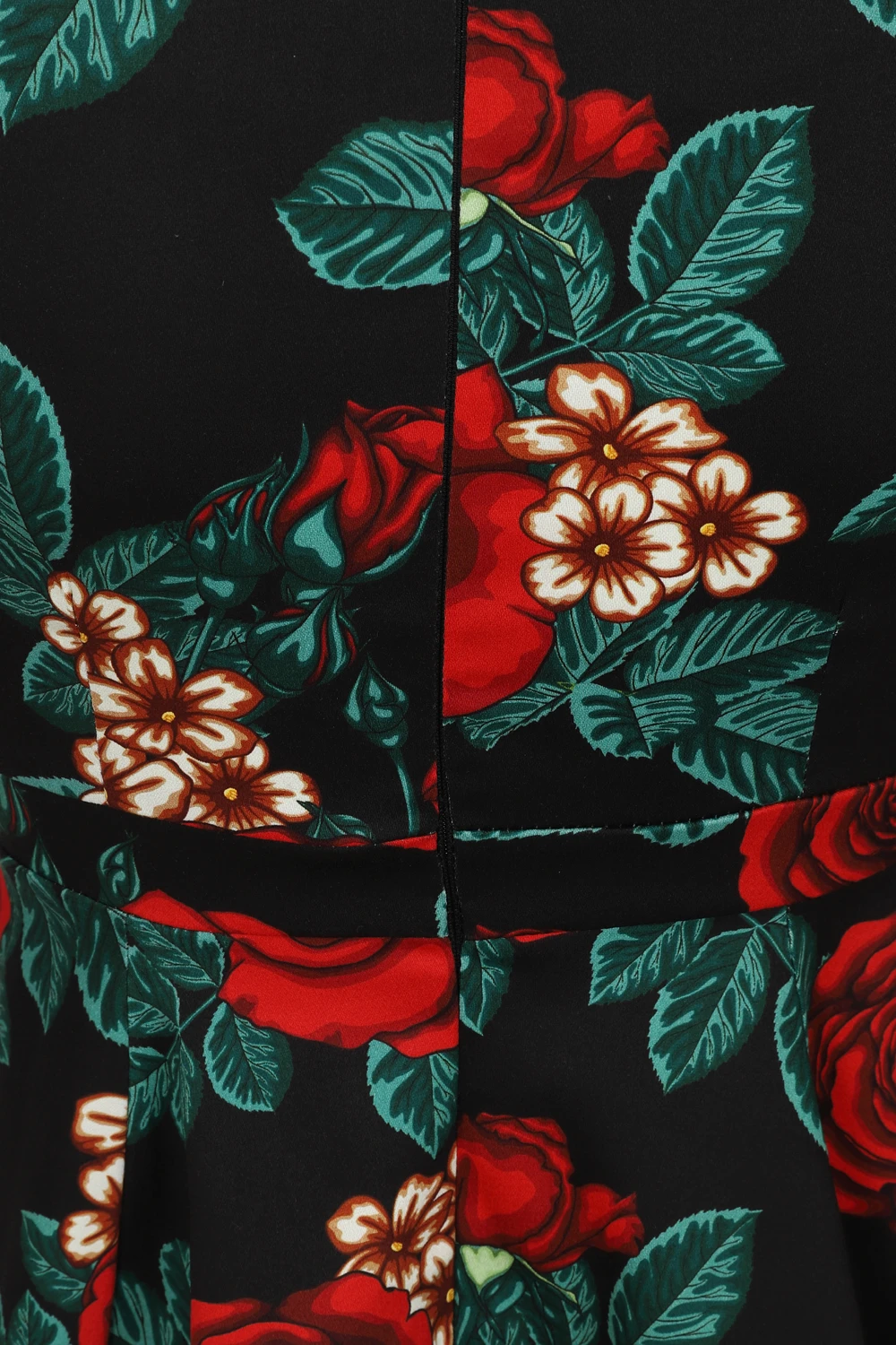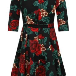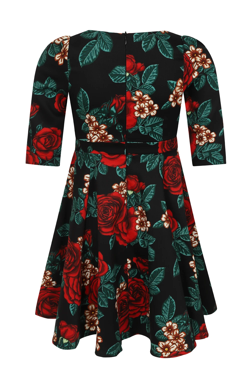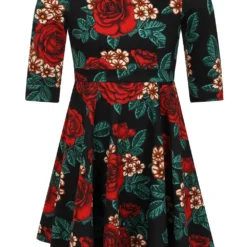 Looking for the perfect vintage girls look? Then the Anne-Marie Swing dress is the one for you! With its classic boat neckline, bold floral print and ¾ length sleeves with cuff detail, this dress will have you looking like a true vintage icon. The waistband adds an extra sweet touch to this piece and the stretch in the fabric makes it as comfortable as it is gorgeous!