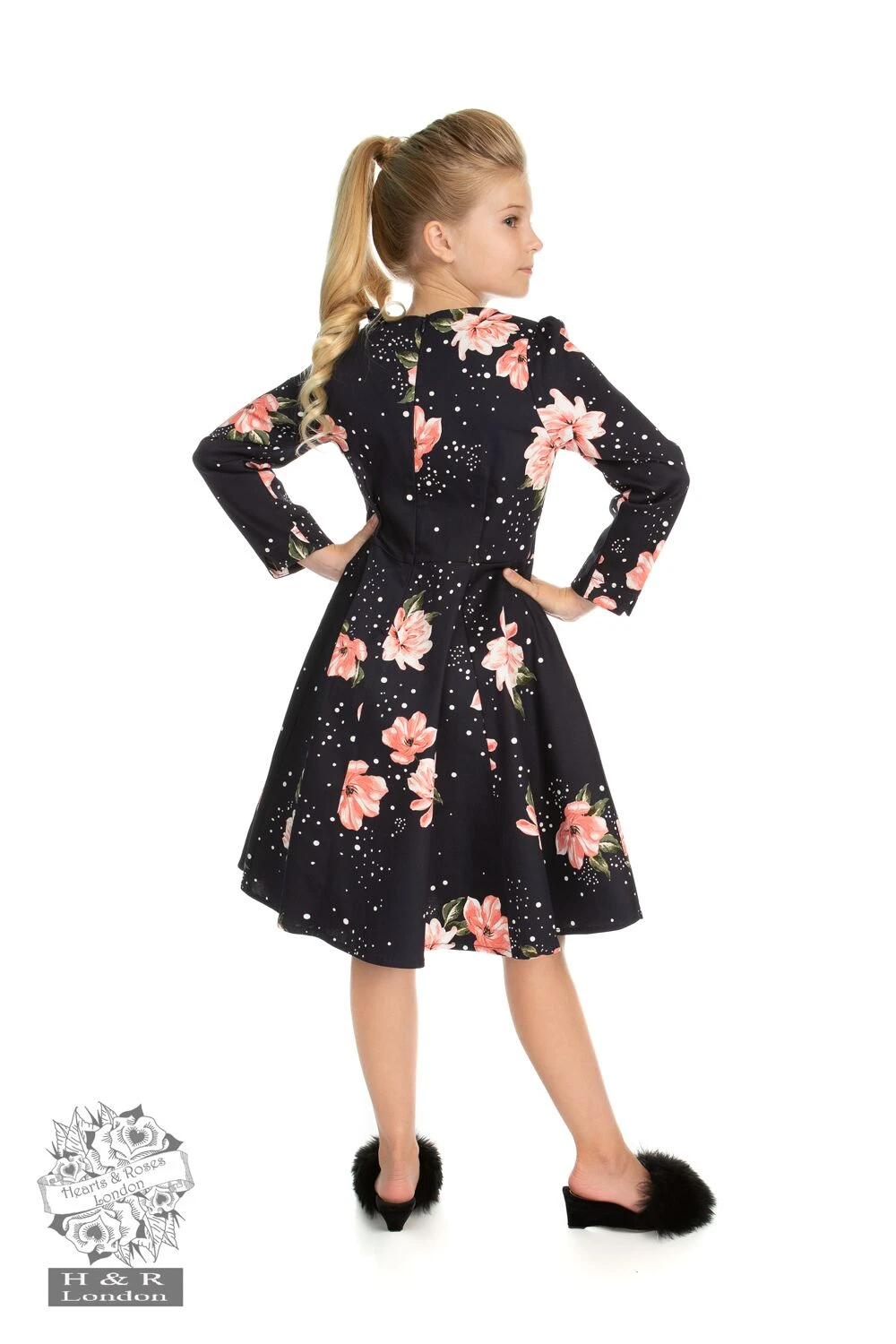 Inspired by our Midnight Swing Dress, we had to bring another design in our magnificent print of florals and stardust. The fabric is made from our classic stretchy cotton in a dark navy shade. Our new kids swing features a round neckline with a decorative front bow. Our new addition will surely give you a touch of vintage, and is a great piece to wear for a special occasion. The print features florals in a soft pink shade, with stardust printed around the flowers. Stock our twilight before it turns midnight.