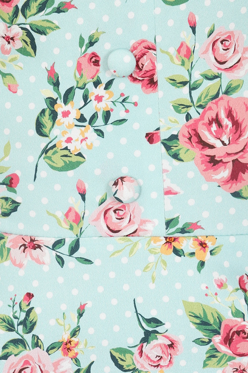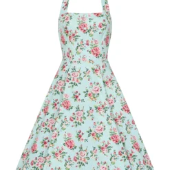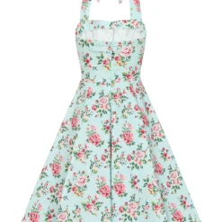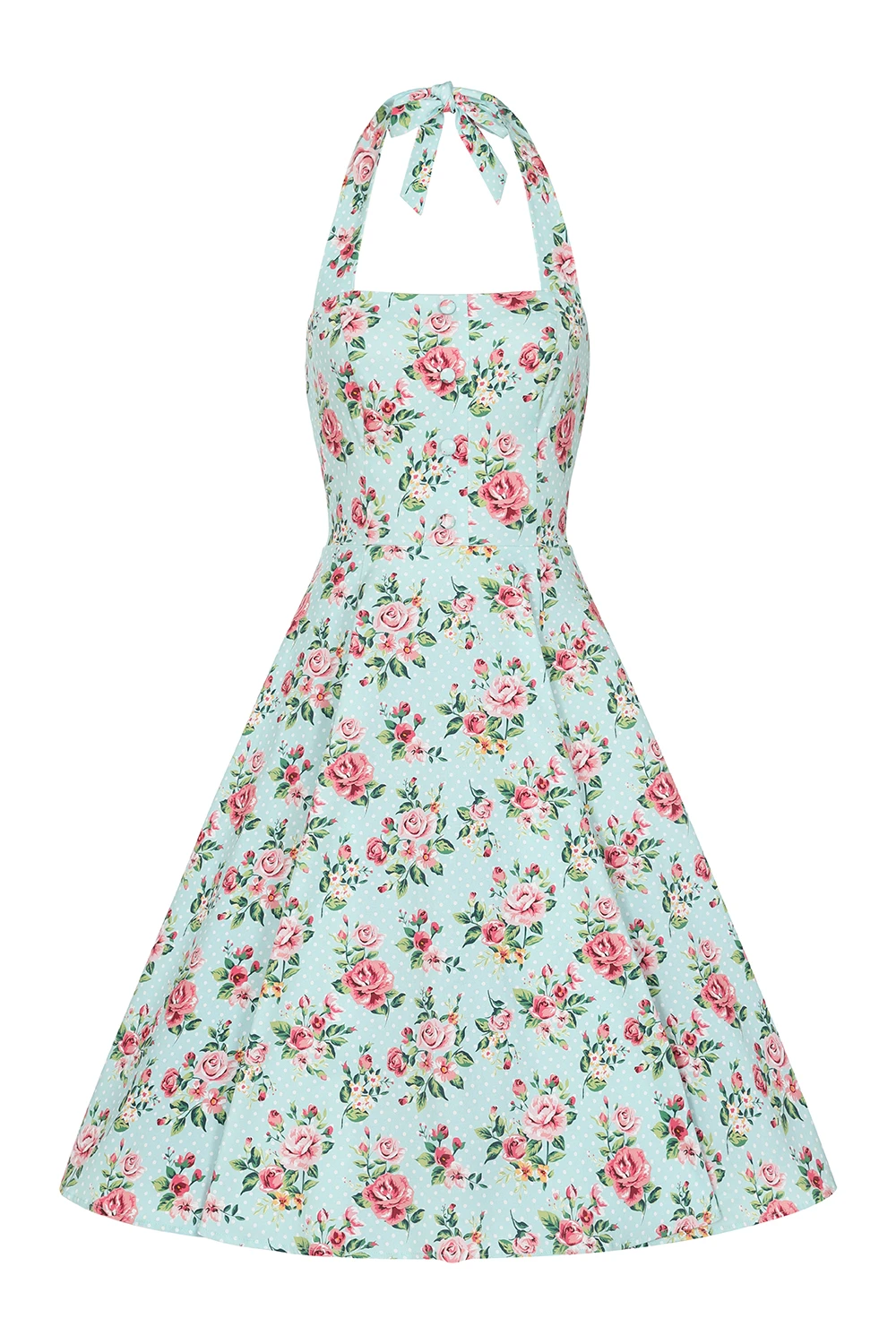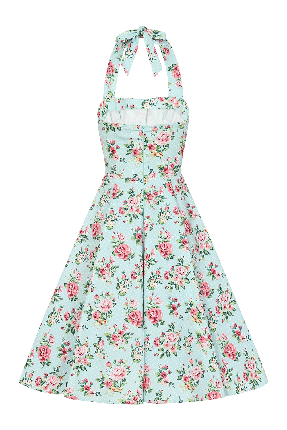 Looking for a 1950’s inspired number? Look no further, as our brand new Heidi Floral Swing Dress is packed to the brim with retro allure. The charming vintage-inspired floral print covers this new swing with pink and yellow florals on a bed of green leaves and a beautiful blue base. The sky blue base is topped with white polka dots to add to that retro feel, giving this style a true sense of beautiful nostalgia. The halter neck is fun and easy to wear, giving the neckline a structured square shape which is flatter for all. The fitted bodice is dotted with sweet decorative buttons and leads down to the full flowing swing skirt, which has our favourite hidden side pockets for extra ease. This new swing is ready to pair with your favourite shoes for your next fabulous event!