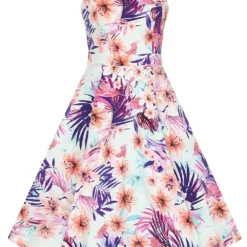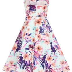 A tropical number, this style is fun for all. The simple neckline with front notch is great for those hot summer days, along with the chic straps which sit neatly on the shoulder. The bodice is fitted and leads to a flattering waistband. This new style has the retro swing skirt which swishes in such a magical way as you move. Bold and beautiful, this tropical print is perfect for summer adventures in the city or for calming walks in the park. The print is made up of splashes of tropical florals and graphic leaves to catch the eye of the beholder. Made to stand out in the crowd, this style will have you looking like a retro summers dream. Pair with flats or heels to complete the look for your next outing.