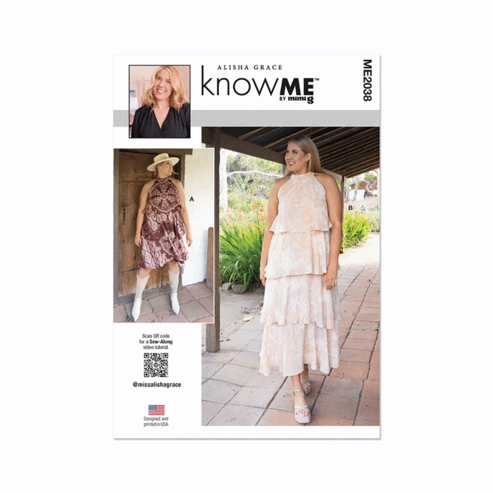 This Know Me Sewing Pattern 2038 (Y5) Misses’ Dress In Two Lengths has a sleeveless multi-tiered dress in two lengths has high neck, lining and invisible back zipper. First ruffled layers are attached at the neck. Under layer attached at the under arms and neckline.