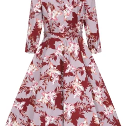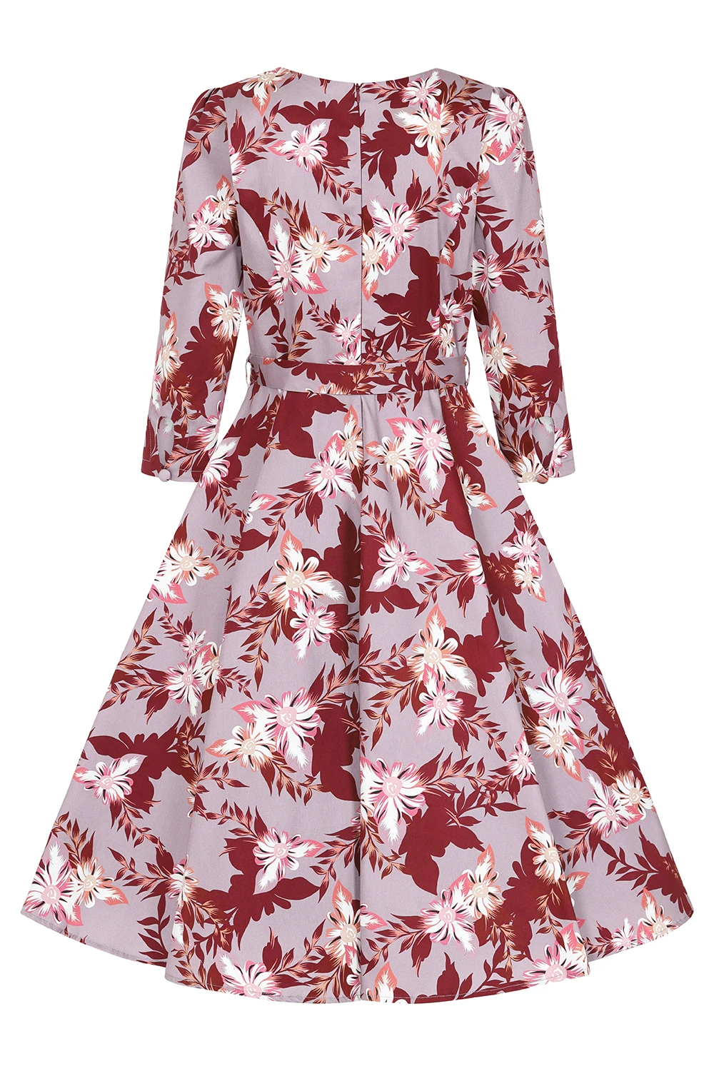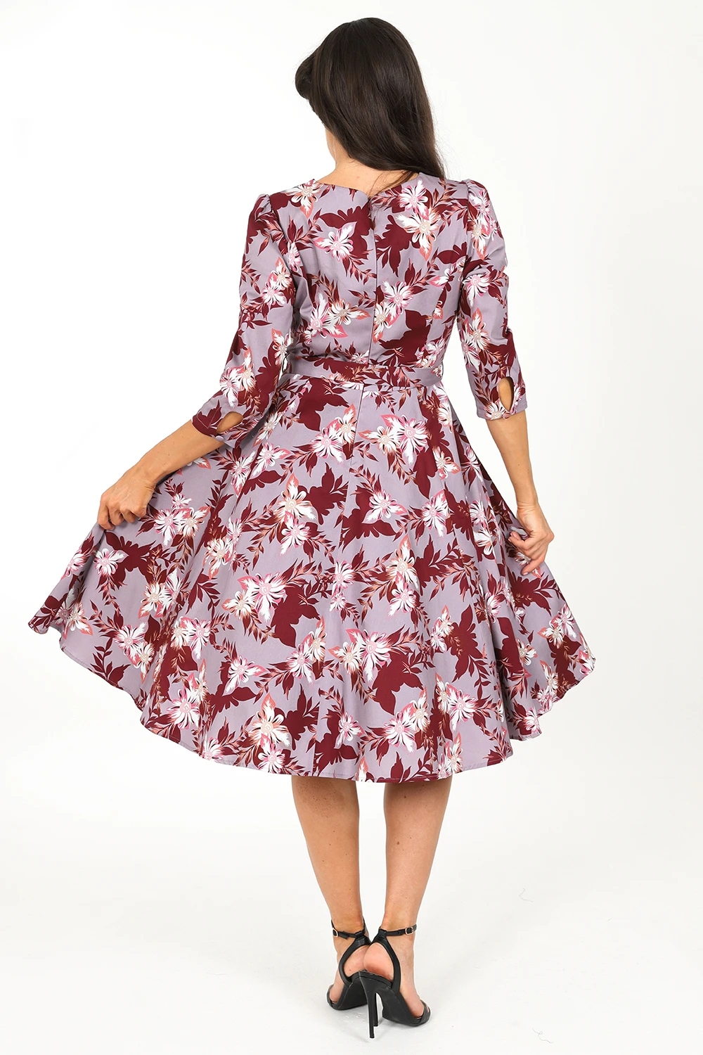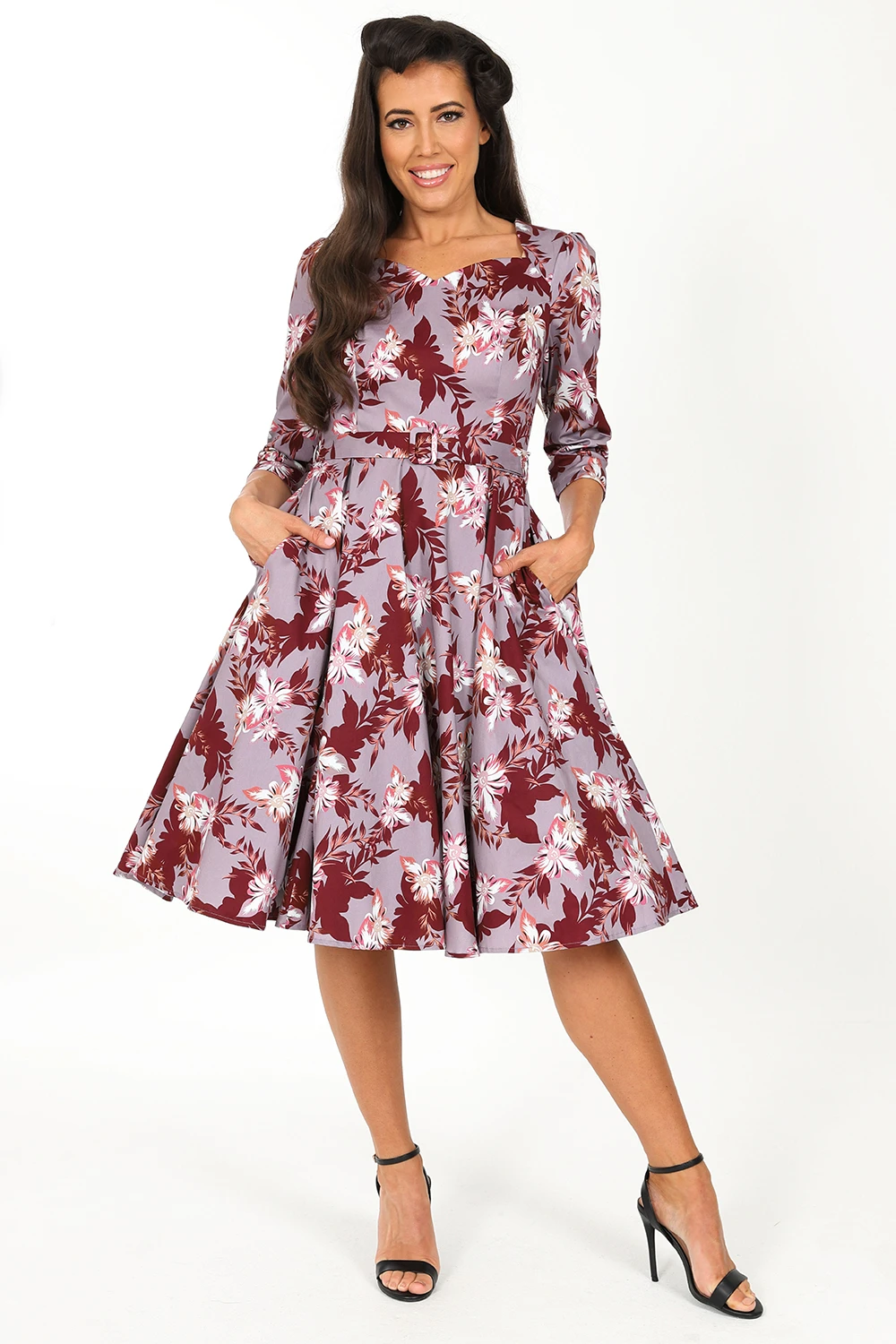 Welcoming our brand new style, the Mariana Floral Swing Dress into our newest collection. This style fits easily into any retro lover’s wardrobe with its subtle purple shades and sweet floral design. The sweetheart neckline gives that feminine flare while being flattering and easy to wear. The ¾ length gathered sleeves have a beautiful sleeve cuff detail which features a keyhole with a single button closure. The flowing swing skirt is great for dancing all night long, spinning and twirling the night away. We have also added our signature hidden side seam pockets for your added ease. The self-fabric belt with buckle cinches in the waist to let the 50s swing skirt move gracefully. Great for day or night, this style is perfect for your next event.