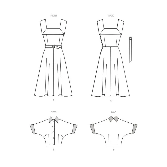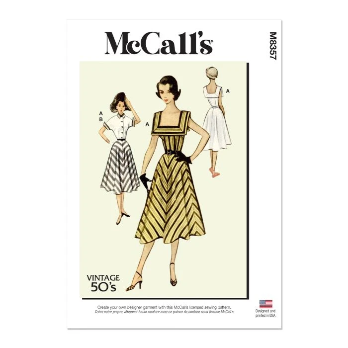McCall’s Sewing Pattern M8357 (F5) Vintage Dress and Jacket is a Vintage 1950s dress which has a square neckline that creates a picture frame effect. Skirt of dress is full and gored. View B Jacket has a front button closure and contrast on collar and cuffs.