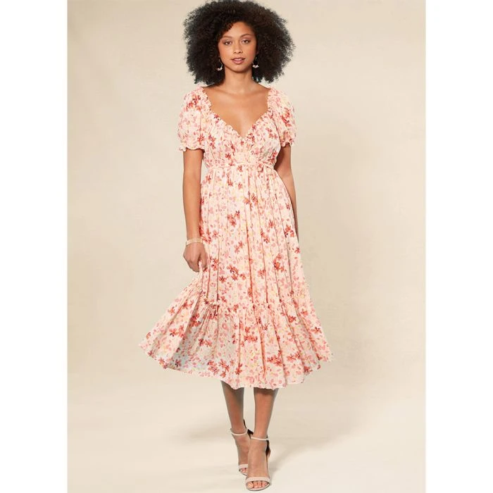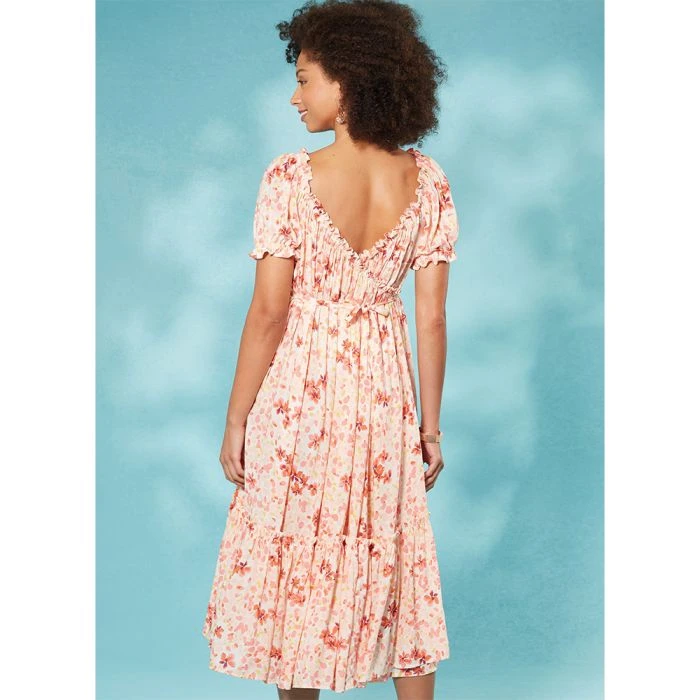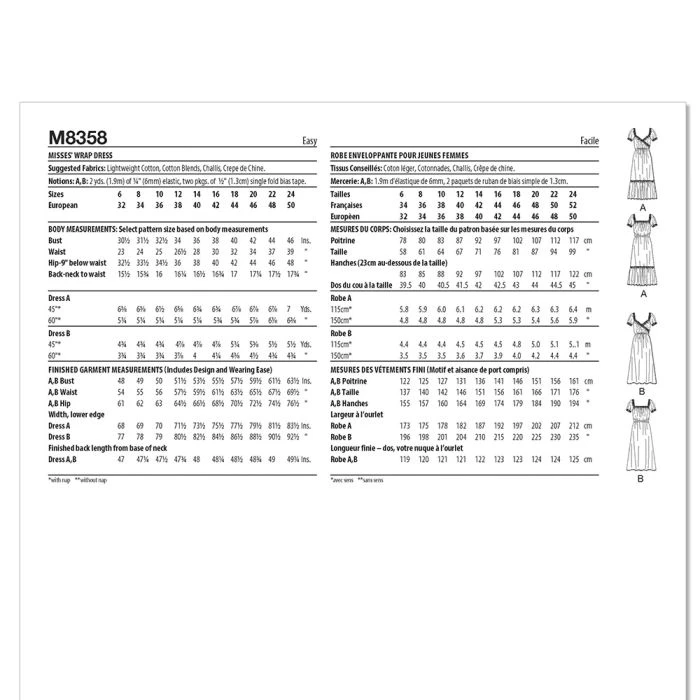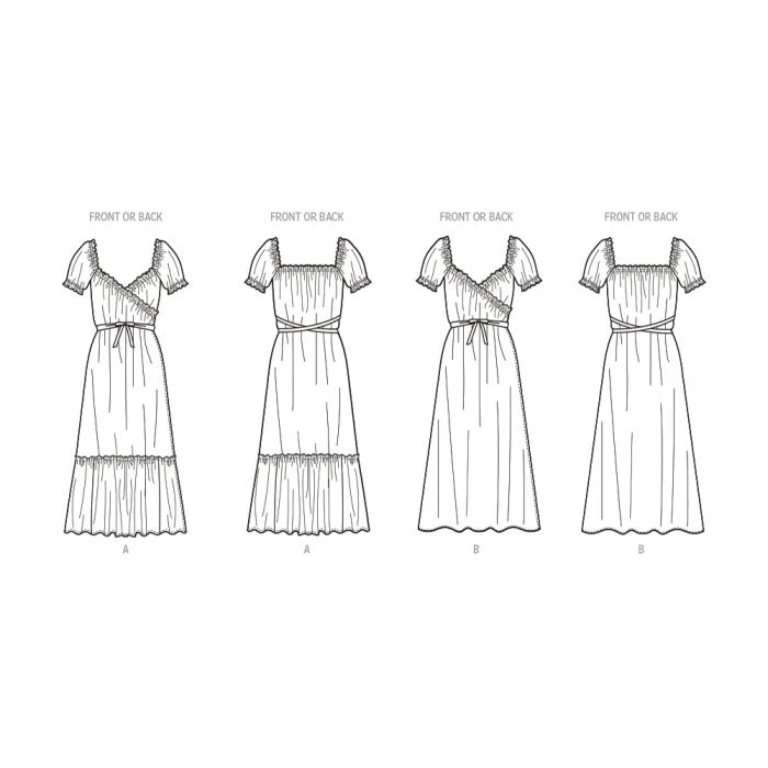 McCall’s Sewing Pattern M8358 (F5) Vintage Dress by Laura Ashley is a Vintage 1970’s Wrap Dress Sewing Pattern. View A and B can be worn with square neckline in front or back, has tie belts, and has elastic in front, back and sleeve casings. View A has lower ruffle.