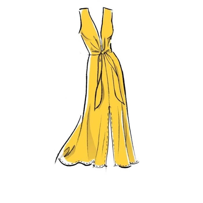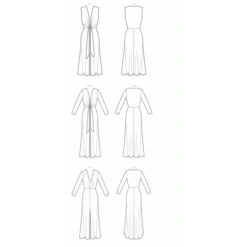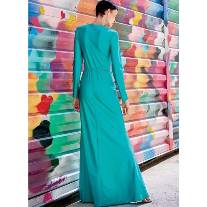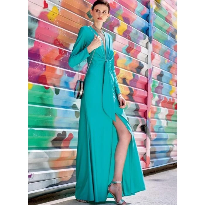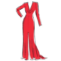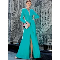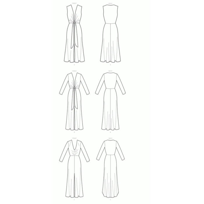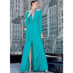 Misses’ evening or special occasion Dresses. Fitted bodice with plunging front neckline with tie detail ordeep cowl-neckline. Sleeveless or full-length sleeve. View C skirt has small train. Designed and sized for moderate stretch knits.