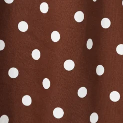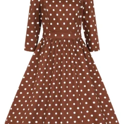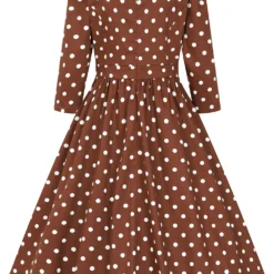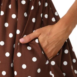 A must have for all vintage polka dot lovers. Milana in retro brown has arrived and we are already in love with her. We know you will fall in love with her too. Milana is an elegant polka dot style, featuring a print of white polka dots set on a beautiful brown cotton fabric. Designed with a fitted bodice she flaunts a simple boat neckline and 3/4 sleeves. We also added a waistband to give you a very feminine piece of wear. Milana will have you looking beautiful while feeling comfy and fashionable. A flowy, eye catching and feminine swing dress.