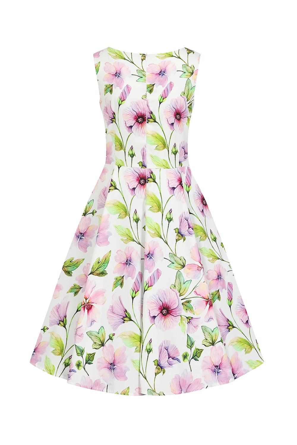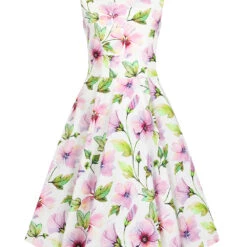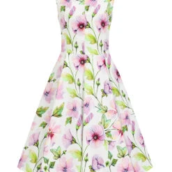 Move with a spring in your step this season, in our Naomi Floral Swing Dress. This print is in full bloom with its purple, yellow and green tones scattered all over the spring white base. The classic 1950s shape of this style with its fitted bodice and full swing skirt, works perfectly in balance with the detail on the neckline. Designed with a boat neckline, this style also features a sweet lapel detail which is topped off with delicate buttons. Perfect for a summers garden party. Just style with your favourite shoes and you’re ready to go!