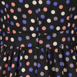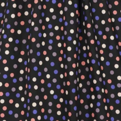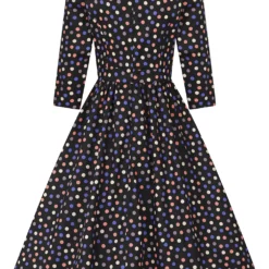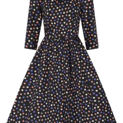 Looking for your next show stopping, head turning dress. Well ladies look no further. This ultimate multi coloured polka dot dress is everything that you need this season. The bodice features a simple neckline, with ¾ sleeves and gathering below the waist belt and long sleeves paired with a full swing skirt. Just ready for dancing the night away. This dress will entice a true vintage lover or even your next lover. Paired perfectly with some heels and a clutch to ensure all eyes are on you.