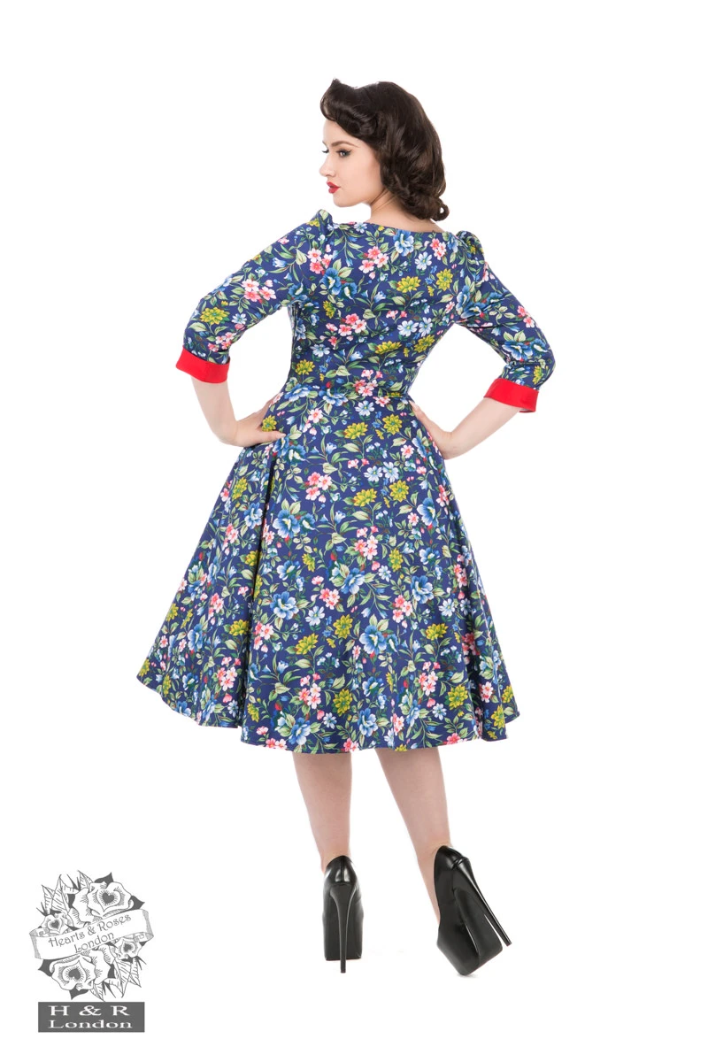Hello, World! H&R London’s day dress! Nothing can overstate the oxford blue ella floral swing dress’ beauty. This wondrous dress is one of the most classic pieces from the collection. The delicate floral print of pink and lilac blossoms set on a sleeve day dress is pinup-perfect, while the front decollete collar adds just a dash of whimsy. Slight V neckline in back shows the nape of the neck. The red cuffs on stand out of the crowd. Dress hits below the knee. Dress zips up the side for a flattering fit.