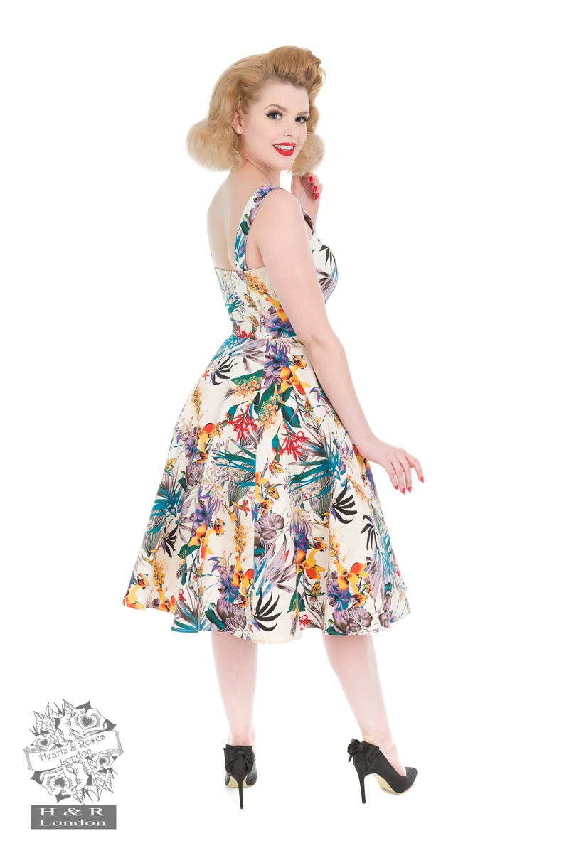 Large green,purple and red florals which creates scenario suited for spring, with violets and gold lilies echoing the sounds of the season! Dress has a full swing skirt and dress zips up at the side for a flattering fit.