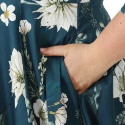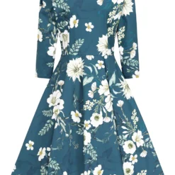 Introducing our Petal Floral Swing Dress, made with a stretchy cotton, this style is comfortable and stylish. The lapel collar gives a formal structured look to the style while the swing skirt adds a feminine flare. We wanted to add to this sweet look by adding front delicate buttons at the front of the dress which lead down to the 50s style skirt. We haven’t forgotten those super handy hidden pockets to add that extra ease to the style. And let’s not forget the beautiful print which covers this dress from top to botton, with a beautiful blue base holding an array of white and soft green florals and leaves. This style is made to be seen this winter. You can add your favourite accessories or wear it alone, this dress is perfect either way.