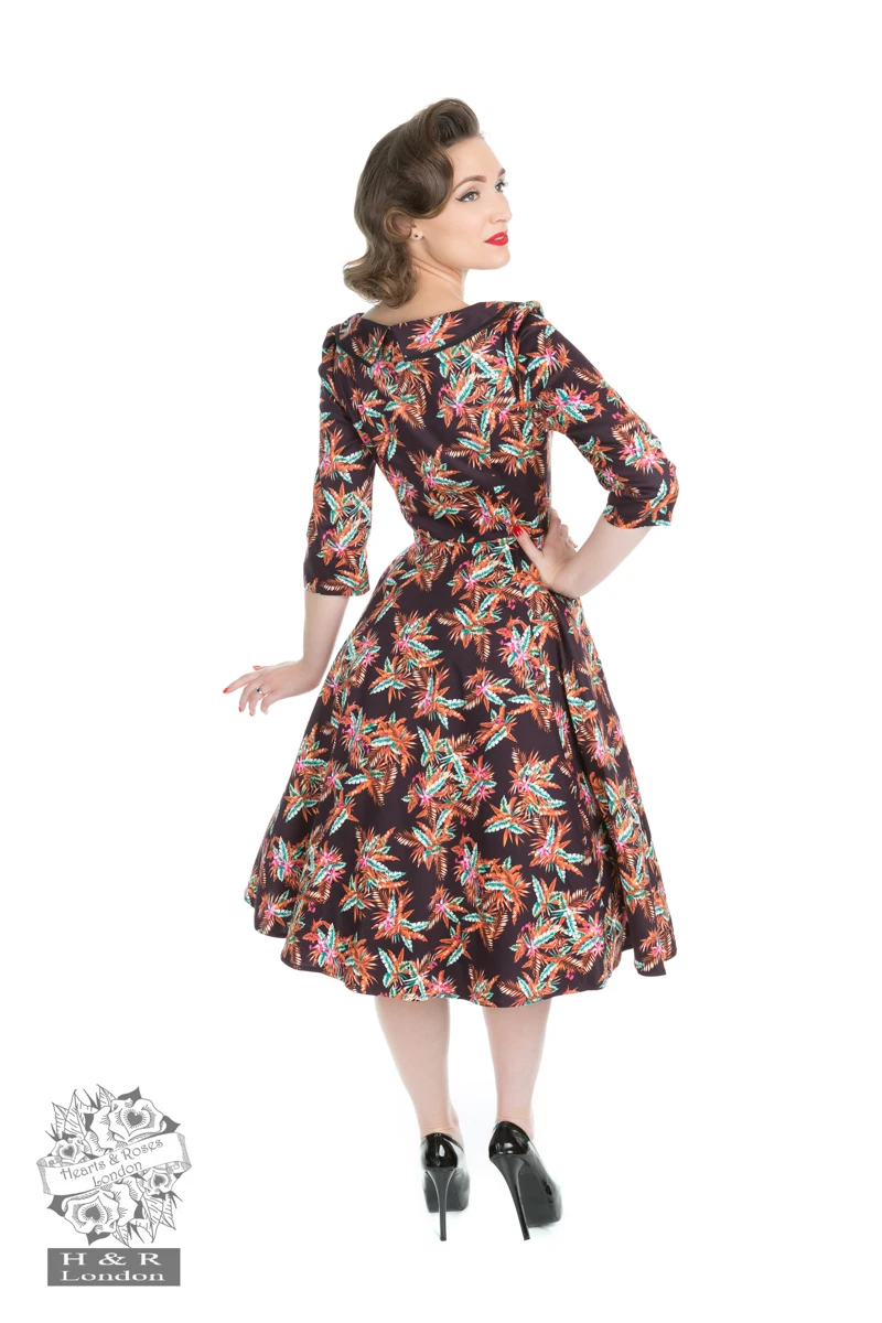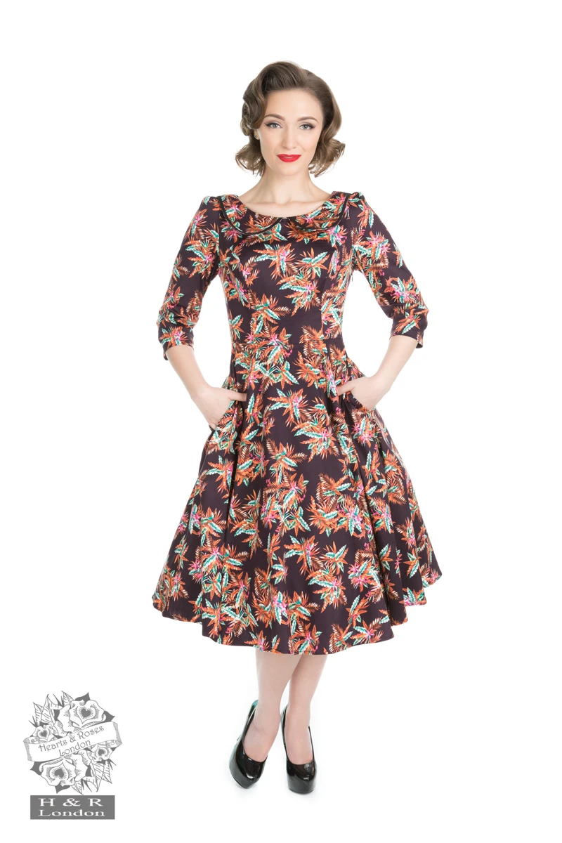 Show off your true colours in H&R London’s Phenomenal Wild Floral Dress. This is a gorgeous vintage inspired dress for any kind of classy and/or stylish occasions. It features peter-pan collar neckline with black trim all around the collar and ¾ sleeves with side pockets. This amazing vintage style swing dress is made out of a soft and wondrously textured cotton set on a brown background with light brown and light green leaves all-over. Dress has a full swing skirt and hits just below the knee and zips up the side for a comfortable fit.