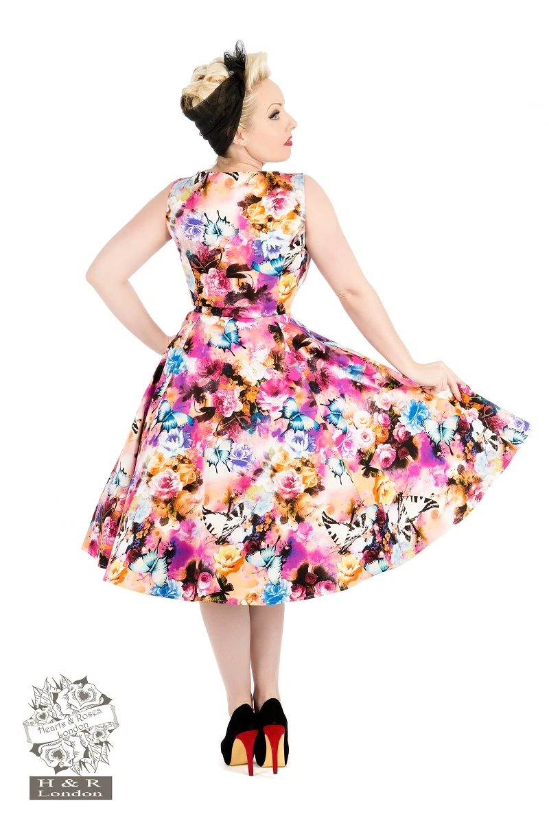 Feel as light and as feminine as a pink cloud in H&R London’s marvellous Pink Cloud Dress. This amazingly unique dress features beautiful blue and white butterflies, pink, yellow, blue and purple roses, intermixed with floating pink clouds. The vivid colours in this unique pattern are made bolder by the black bodice design. Dress is sleeveless, with a Queen Anne neckline and a black illusory panel down the front. Dress has a full swing skirt and zips up the side for a flattering fit.