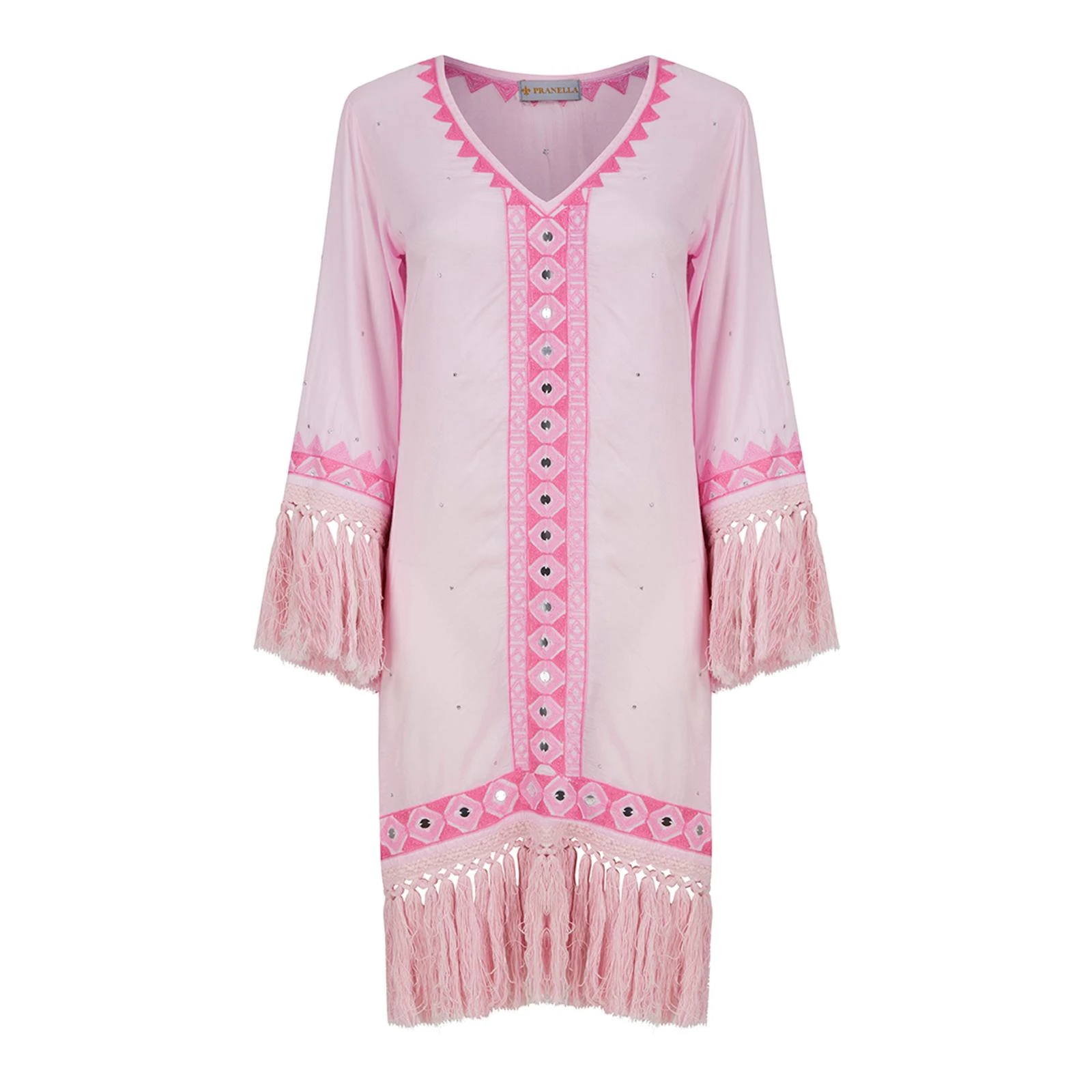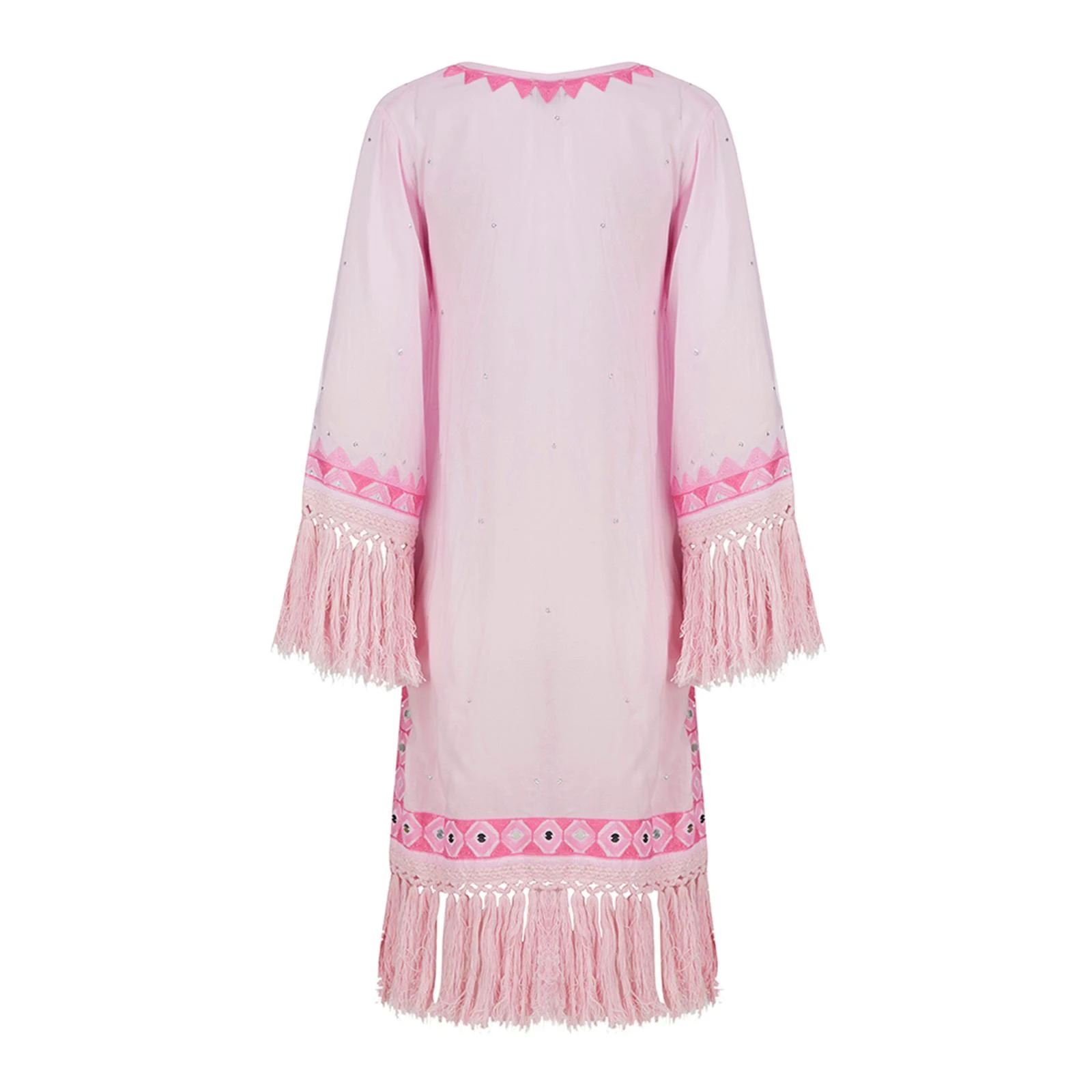 - Her luxurious cotton tassel fringing to the hem and sleeve adds movement and motion to this fun little mini.
