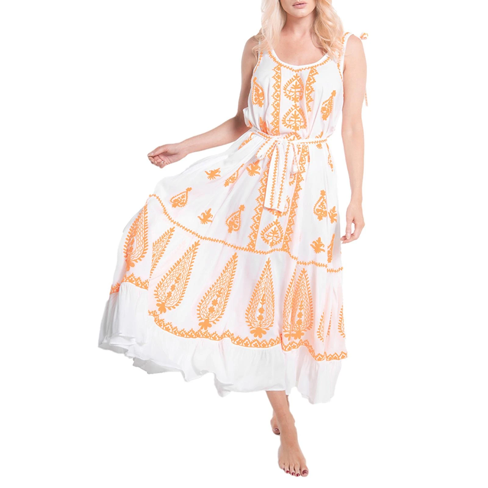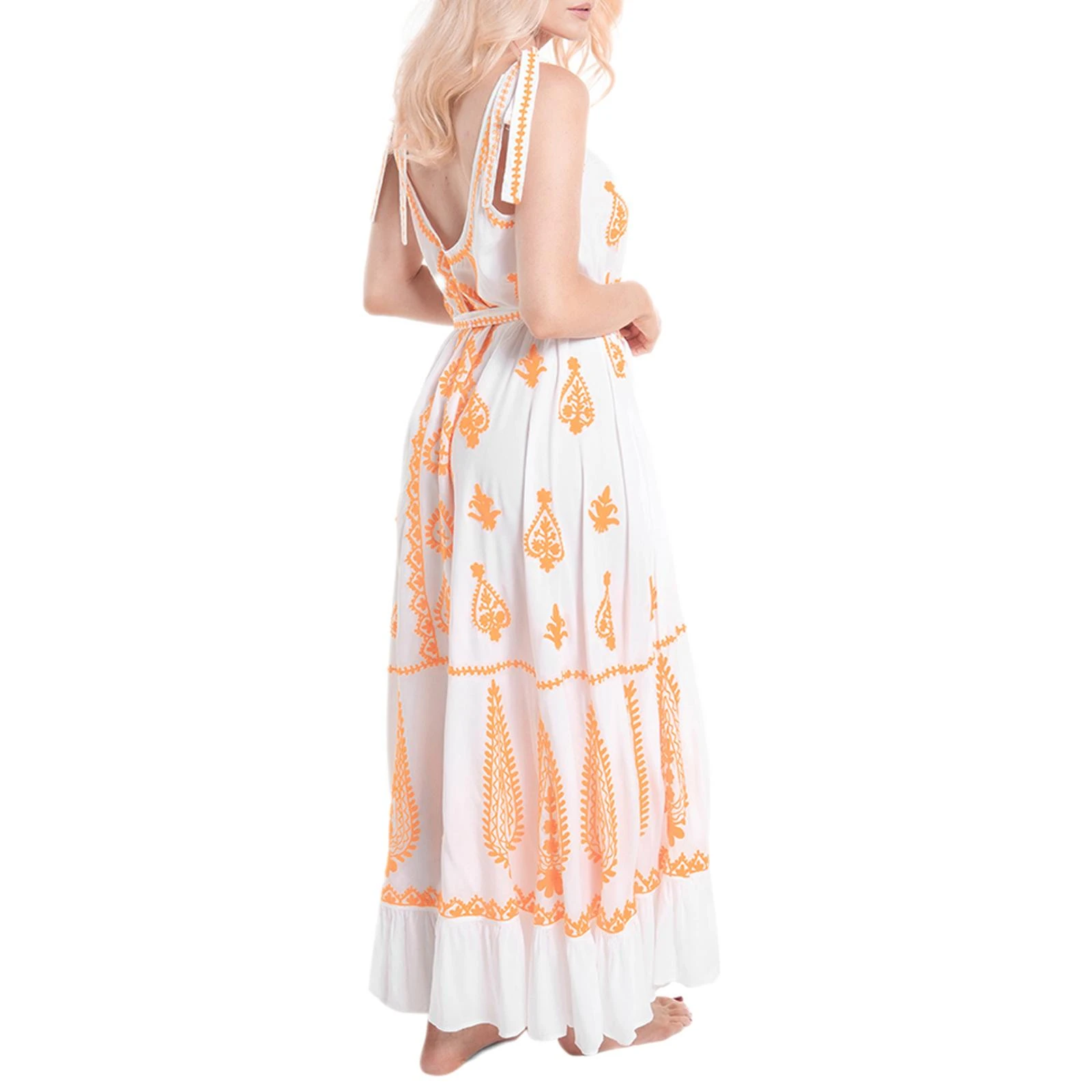 - The Atzaro is relaxed, thrown-on-anywhere essential. Flowing lines to the full bodice and maxi skirt are balanced by optional ribbon ties to the waist and shoulders. A subtly ruffled hemline adds a romantic touch, while side pocketsgive functionality.