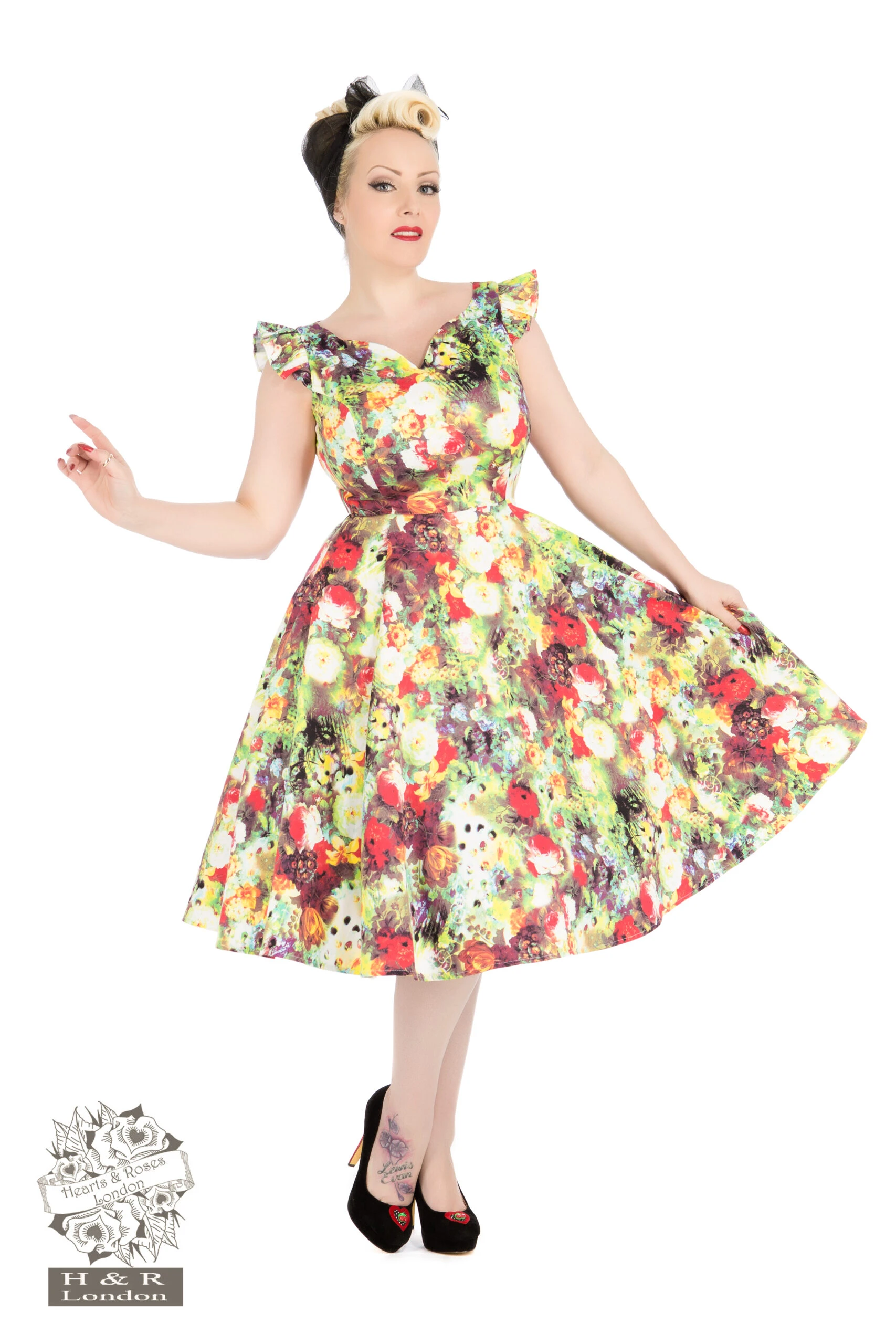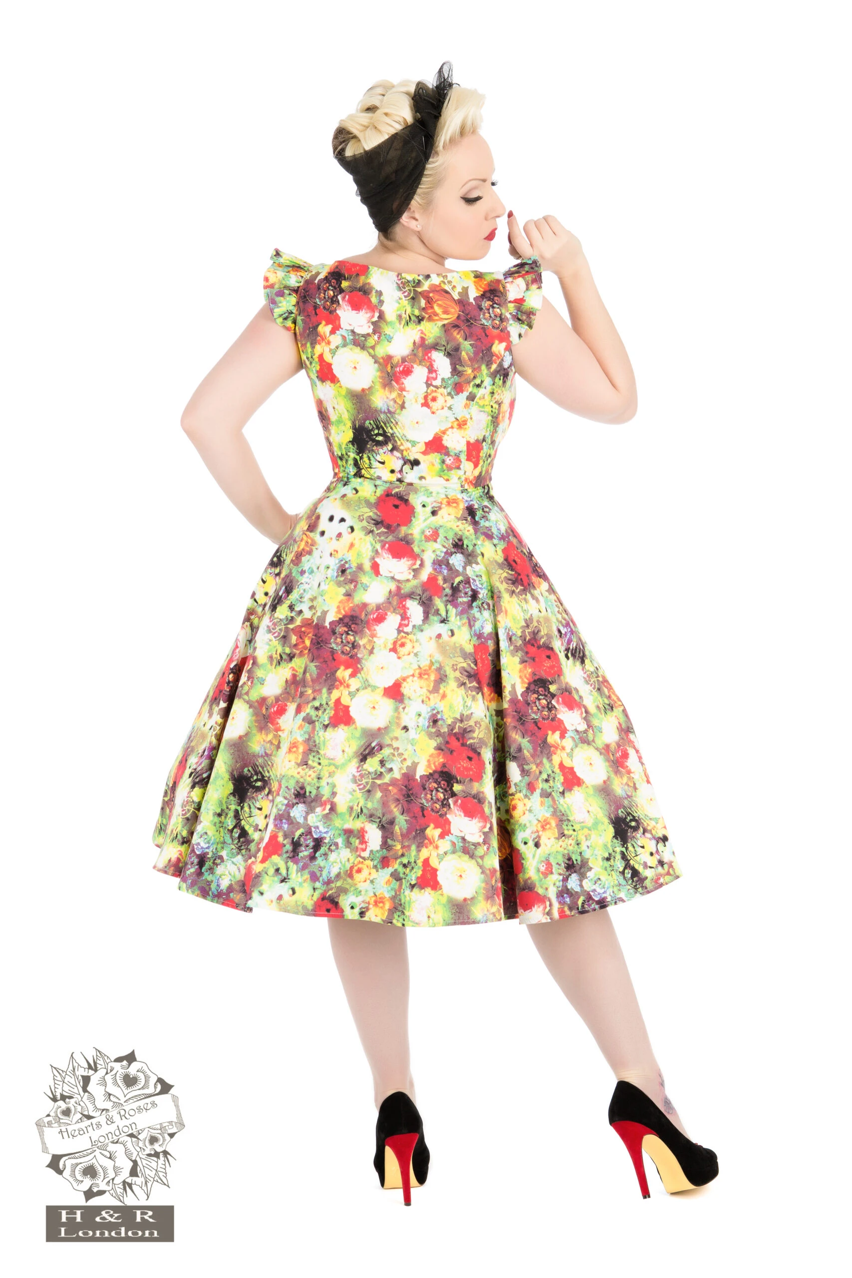 The sky is grey, the sun is nowhere in sight and there is nothing to wear? Cheer up, H&R London has just the dress! Throw on the Rainy Day dress and watch how the skies brighten! Beautiful swing dress with a flutter ruffle on the sleeves, this dress features beautiful hazy colours of red, light yellow, light green, and mauve that create a beautiful abstract watercolour floral pattern. A high sweetheart neckline and a full swing skirt make this dress the perfect dress to turn that frown upside down!