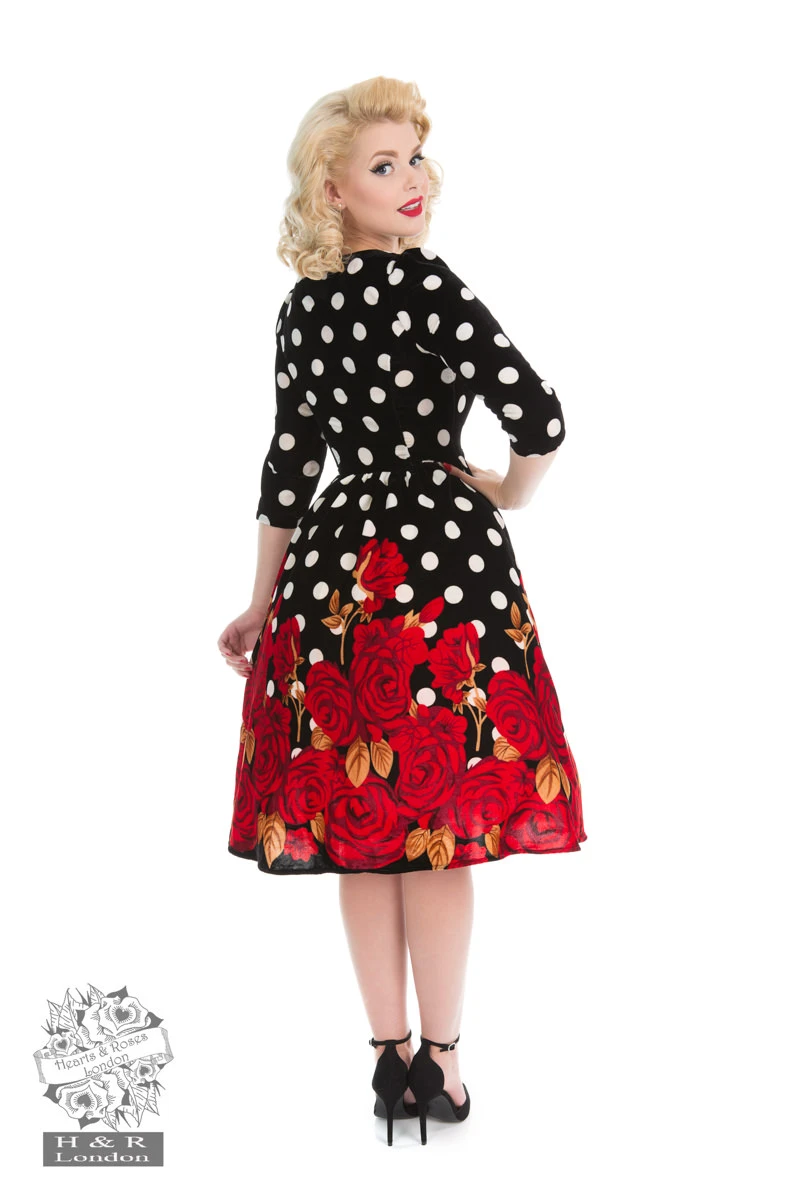 We bring to you our new modern velvet swing dress, fabricated on a lovely soft velvet fabric, perfect for those cold winter nights. With ¾ sleeves and a round neckline, the design features large bold prints of red roses, with white small polka dots across the rest of the fabric. This is a one of a kind design, as the mix of roses and polka dots gives the fabric that vibrant look and feel. She can be worn in all kinds of occasion; surely a winter must-have. Before I forget, she also has pockets!!