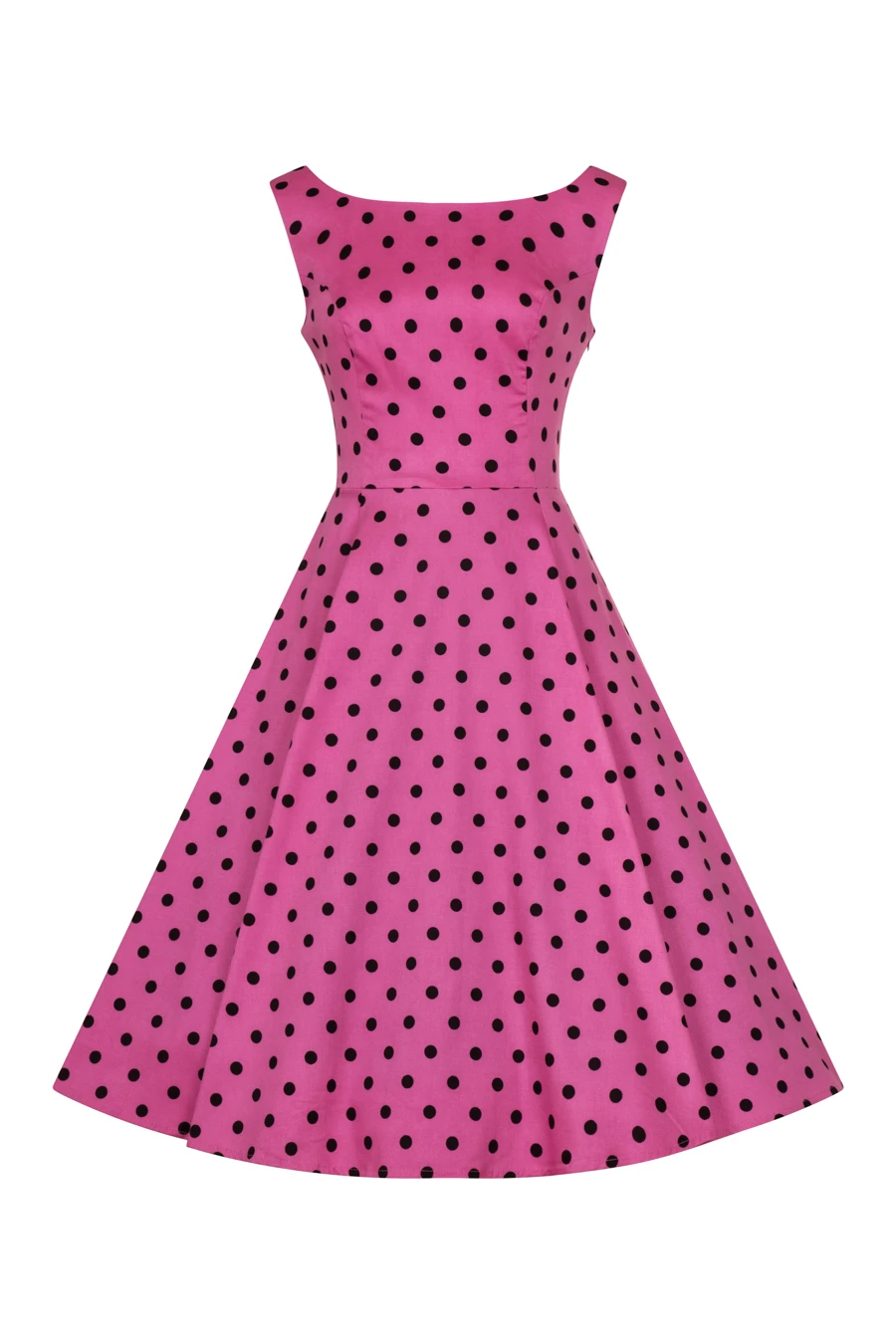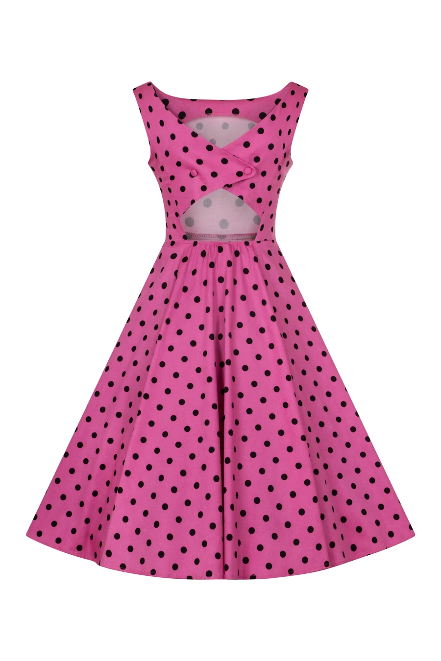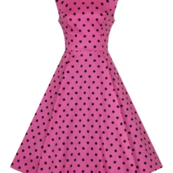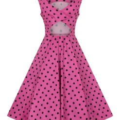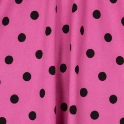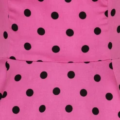 Vintage Pinup style lives in the Rhiannon Swing Dress, new from H&R London! Classic vintage-style party dress made out of soft and stretchy cotton. This dress features a contrasting pattern of small black polka dots on a raspberry pink colour background. The dress is sleeveless, with a cut out in the back waist and a square cut neckline. The Dress zips up the side and two decorative fabric buttons.