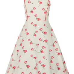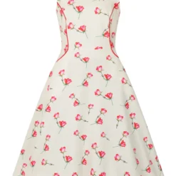 Our beautiful Sorella Summer swing is here! Perfect for dancing, romancing and drinks with the girls. This cute little number has a delicate floral rose print with a beige base. Sorella will have you looking your ultimate best with its fitted bodice which is embellished with lovely red piping flowing down the bodice all the way to the hem of the pockets. Our Sorella dress hovers just below the knee with is a full swing skirt. This pairs perfectly with heals and some statement jewellery for a day out in town!