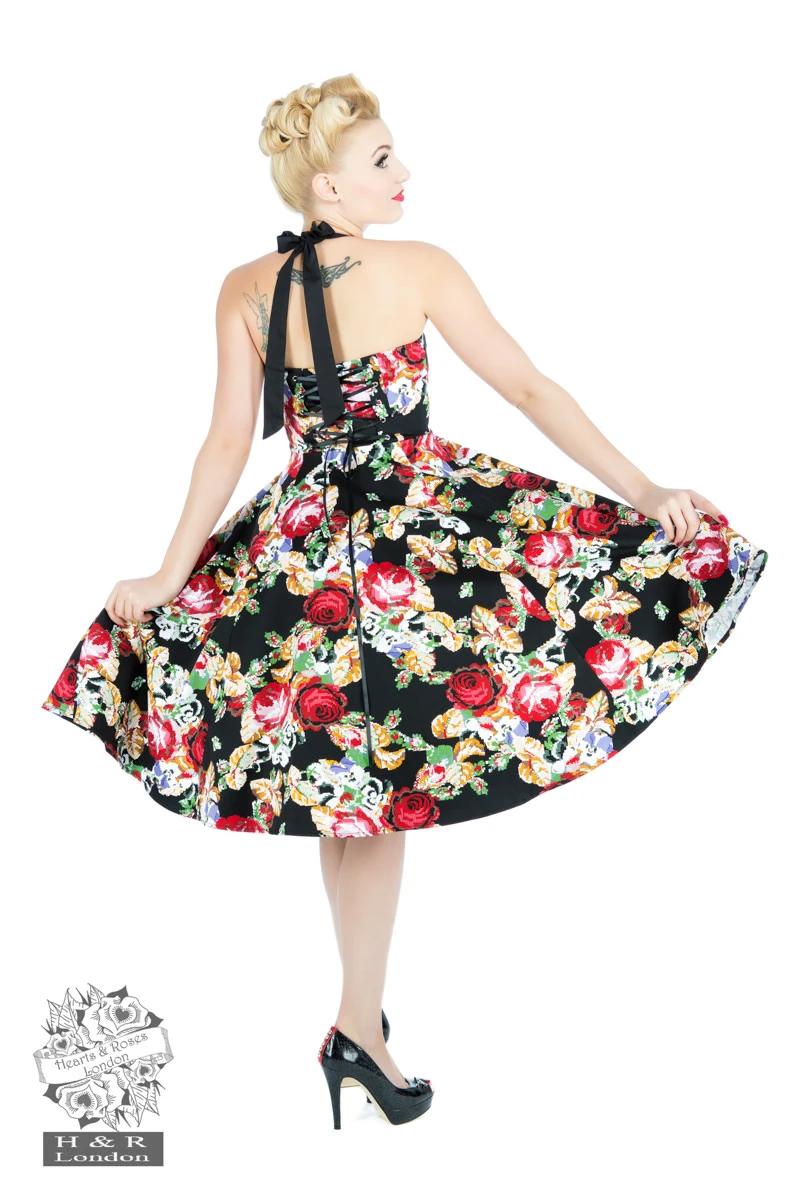 H&R London’s Susie Halter Dress fit to be tied! Flattering halter-style dress has a cute, vintage-style pixellated floral pattern all over this dress. Vivid colours of red roses and bright green and gold leaves create a beautiful autumnal pallette set on a black background. Black halter straps tie at the neckline and the grommets and lacing in back are full adjustable to create the perfect fit. Bodice has bust darts and cup stitching to define to bust line. Dress has a full swing skirt that hits to just the knee. Hidden side zip. Be a cutie in the Susie!
