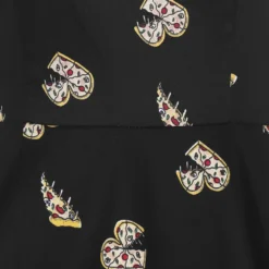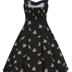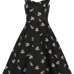 Our new pizza print swing dress will have you wanting more of this delicious print. With heart shaped slices laid out on a black back drop, this print is a treat for the senses. This one is for all you playful vintage lovers looking for the perfect quirky print to dance in this summer. With its delicate sweetheart neckline, playful gathered shoulder straps and flowing skirt, this dress is one to have fun in this summer!